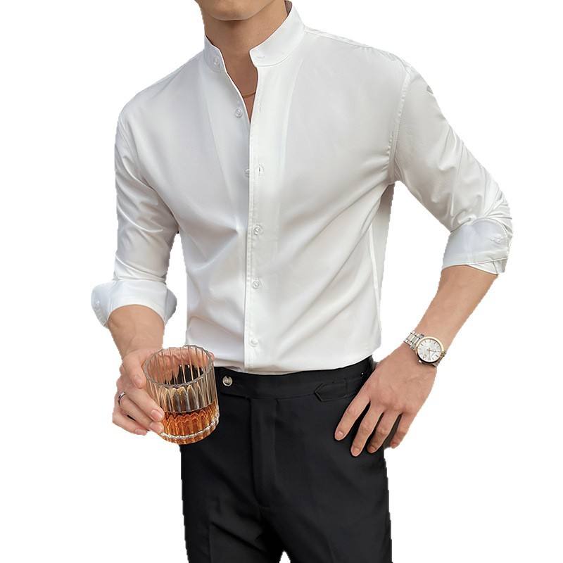 เสื้อเชิ้ตผู้ชายแขนยาวผ้าทอจีนประดับลูกปัด คอจีน ไม่ต้องรีด สีพื้น ยืดได้ ทรงหลวม สีขาว สำหรับงานแต่งงาน