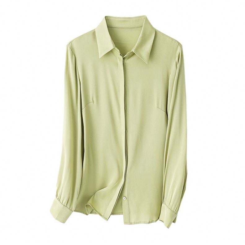 เสื้อเชิ้ตผ้าไหมแขนยาวหนาสำหรับผู้หญิงสไตล์สำนักงานทรงหลวมพร้อมกระดุมตกแต่งโลโก้ด้านหน้าสำหรับฤดูใบไม้ผลิ
