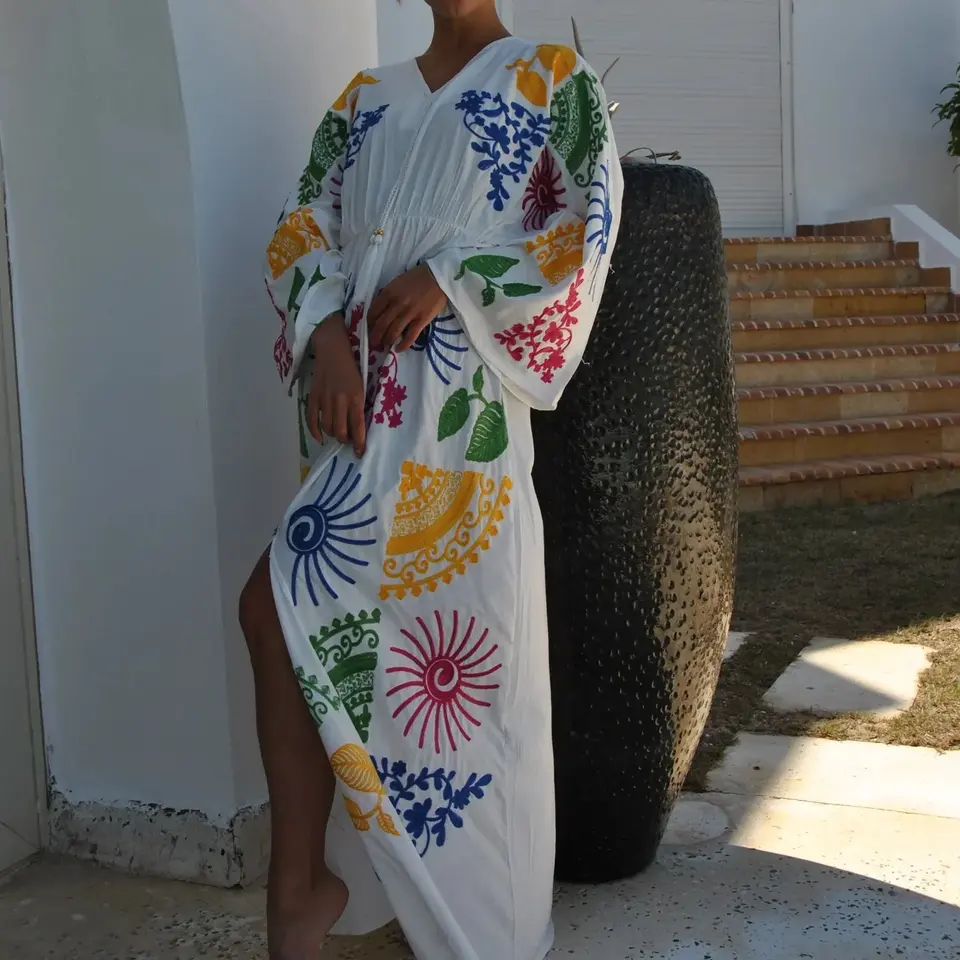 ฤดูใบไม้ผลิเซ็กซี่สุภาพสตรีลึก V คอวันหยุดชายหาดดอกไม้ปักโบฮีเมียผู้หญิงชายหาดผ้าฝ้ายยาว Kaftan ที่ดีที่สุดราคา