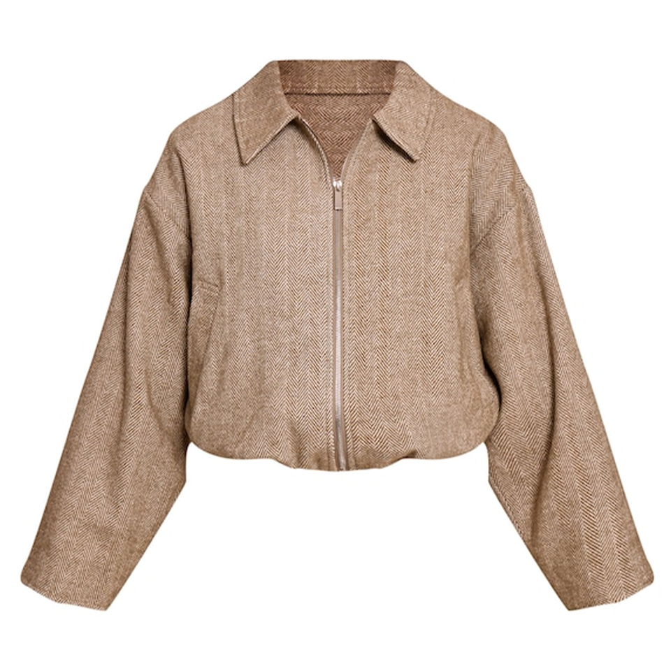 เสื้อแจ็คเก็ตบอมเบอร์ทรงโอเวอร์ไซส์ผ้าไหม/ผ้าฝ้ายสำหรับฤดูใบไม้ผลิ คอวี ซิปด้านหน้า พร้อมดีไซน์ทันสมัย