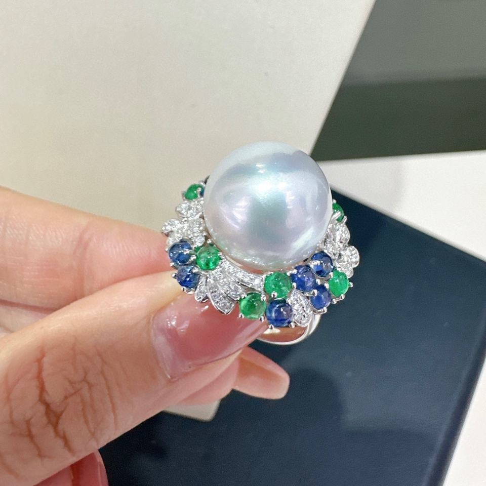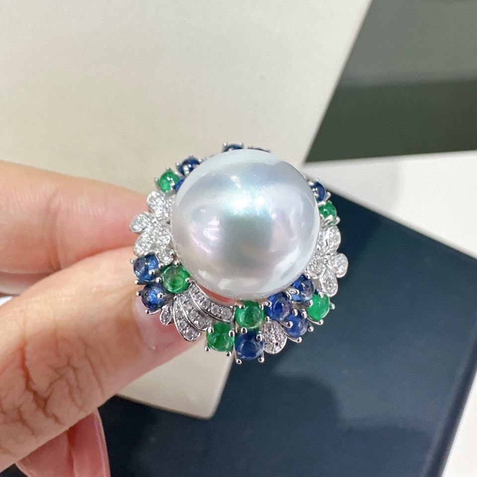แหวนหรูหราสำหรับฤดูใบไม้ผลิและฤดูร้อน ไข่มุกธรรมชาติทรงกลมขนาด 14-15 มม. คุณภาพเทียบเท่าไข่มุกสีขาวออสเตรเลีย สไตล์ฝรั่งเศส น้ำหนักเบาและเป็นสินค้าใหม่
