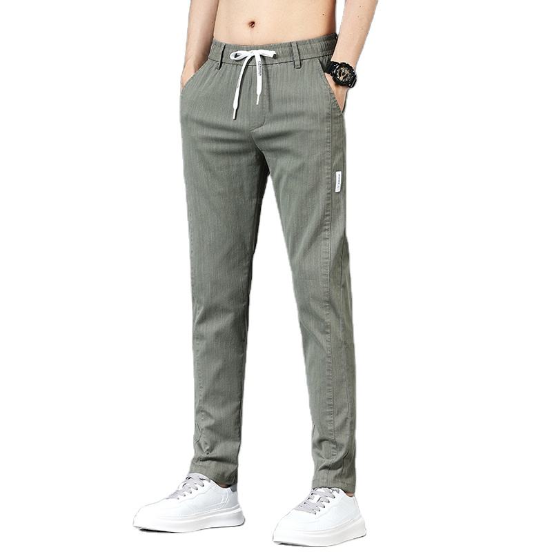 กางเกงลำลองผู้ชายสำหรับฤดูใบไม้ผลิฤดูร้อนกางเกงแฟชั่นแบบบางเอวยางยืดสไตล์เกาหลีกางเกงขายาวทรงตรงเข้ารูปสีเขียวน้ำเงินเทาสีกากี