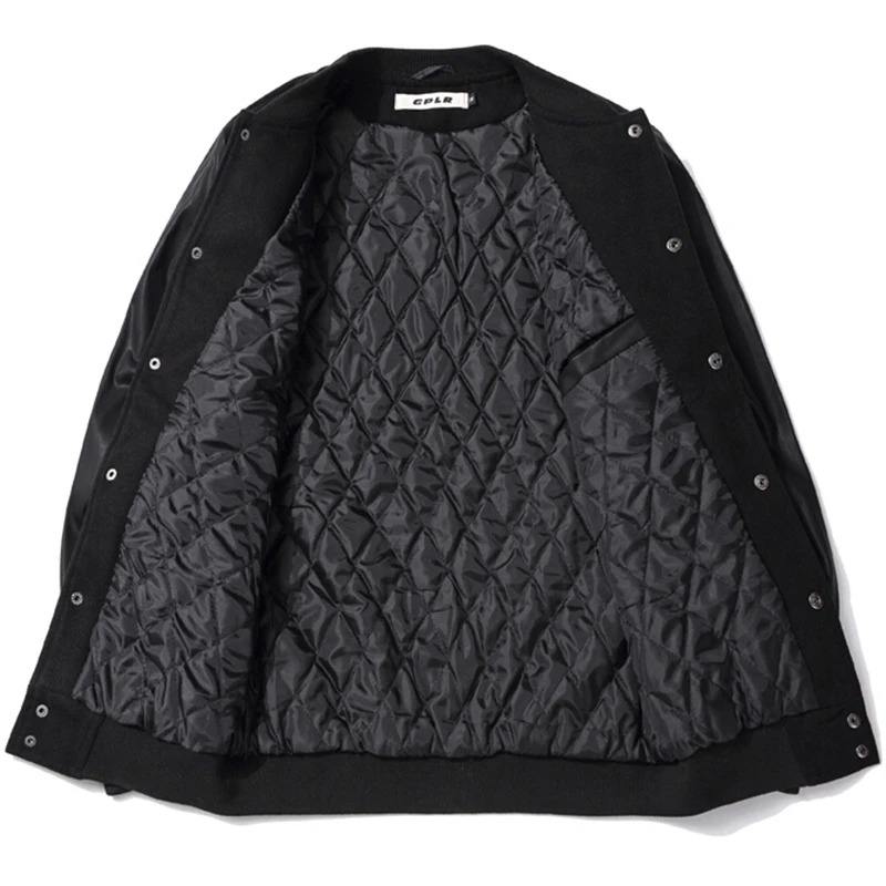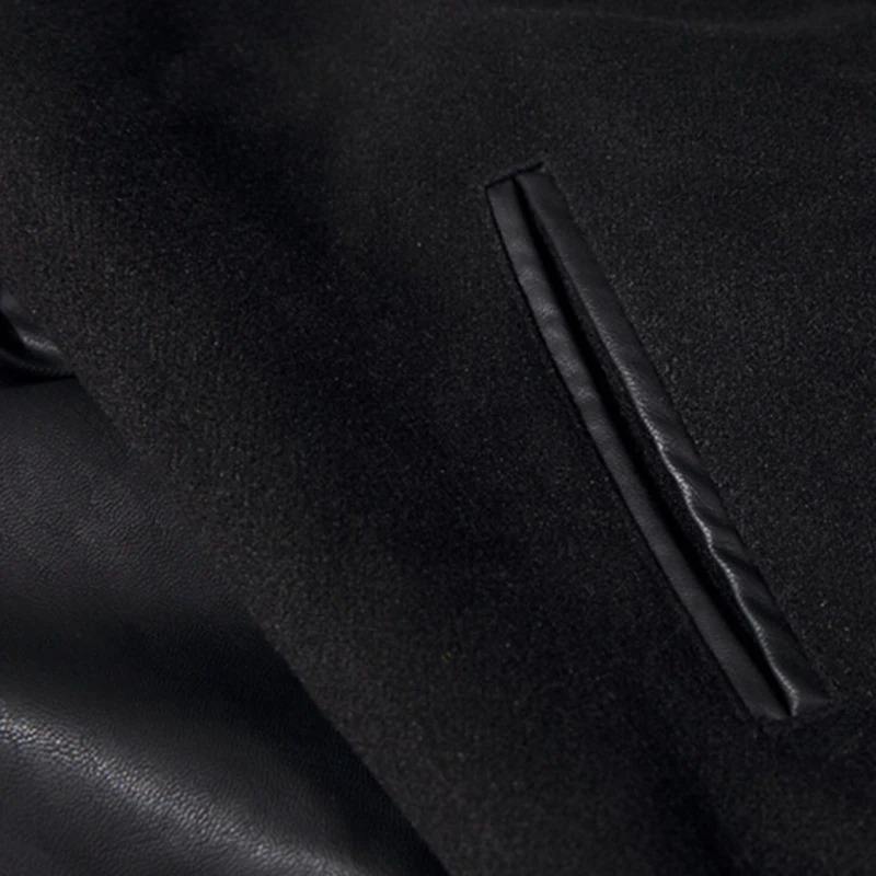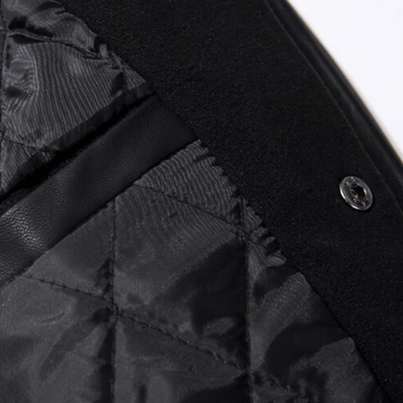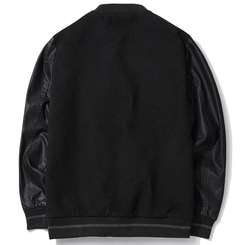 เครื่องแบบทีมโรงเรียนเสื้อแจ็คเก็ตเบสบอลแขนหนังแท้สีดำเสื้อโค้ทตัวอักษรสำหรับนักศึกษาฤดูใบไม้ผลิฤดูหนาว