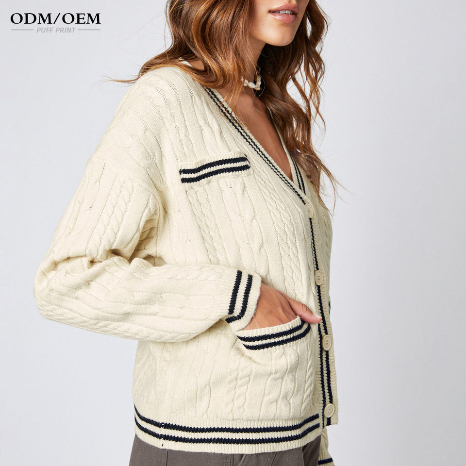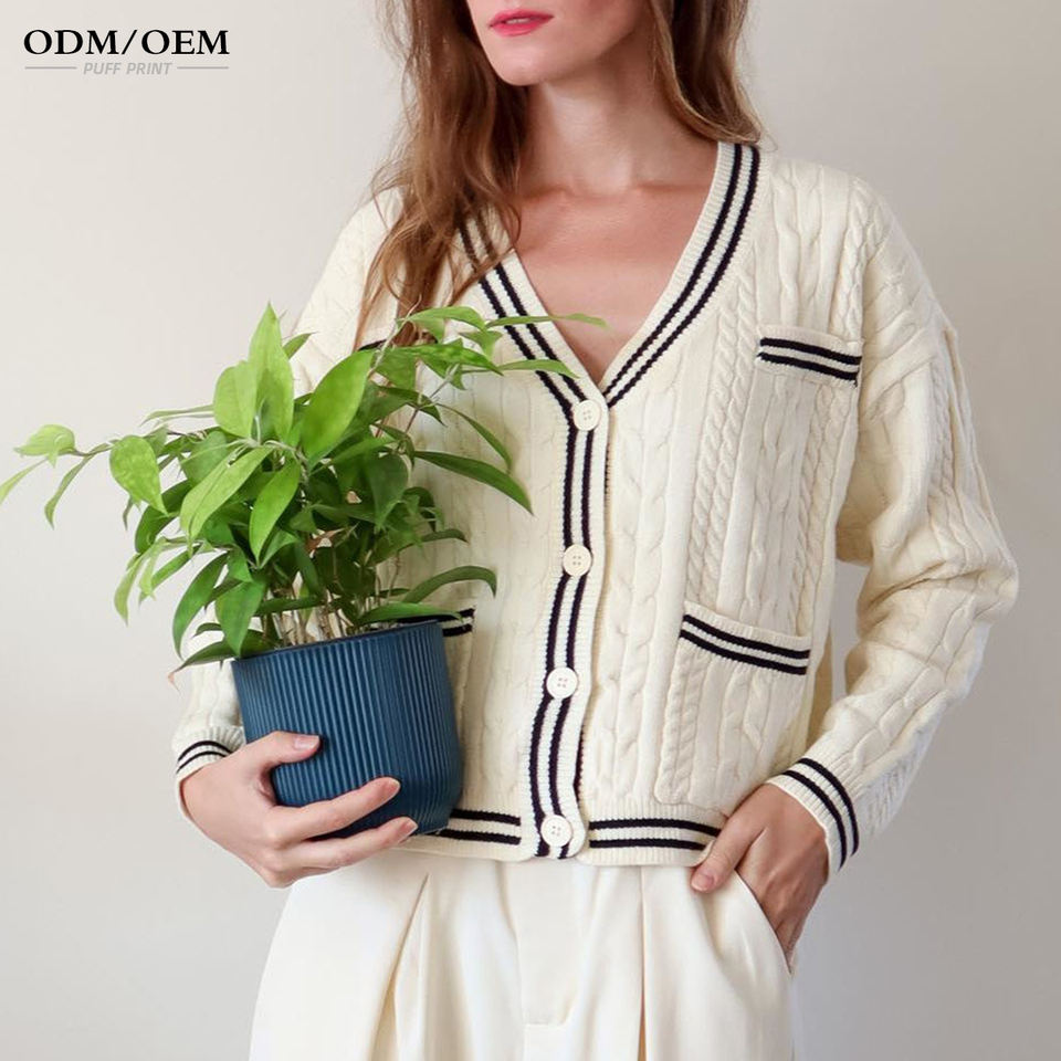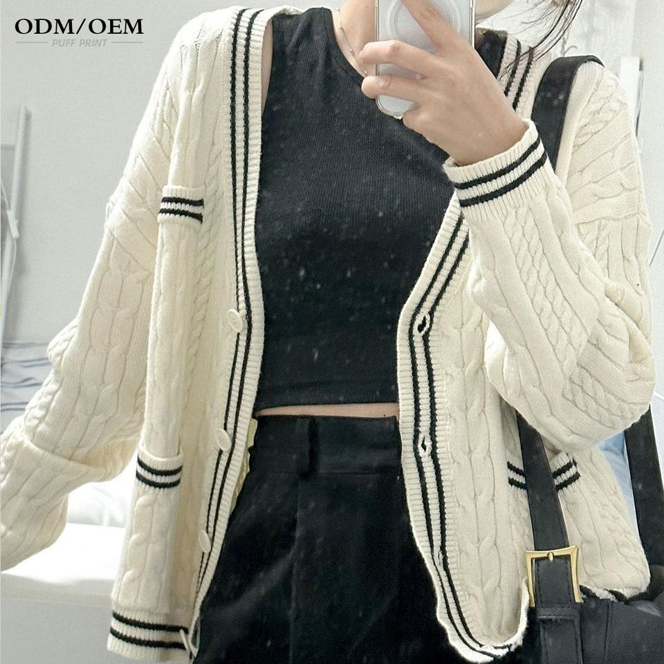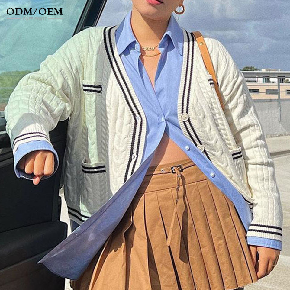 เสื้อคาร์ดิแกนผู้หญิงสีเบจ คอวี ปักลายดาว สไตล์ลำลอง แฟชั่นเก๋ไก๋ แจ็คเก็ตถักนิตติ้ง สไตล์ Y2K สตรีทแวร์