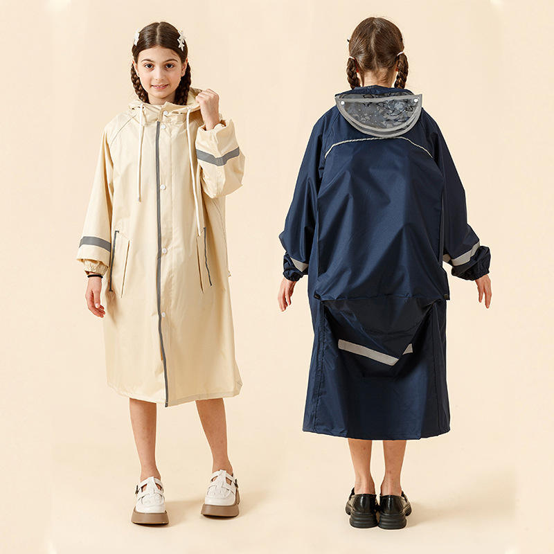 เสื้อกันฝนเด็กน้ำหนักเบาสำหรับตั้งแคมป์ ยี่ห้อสปริง ยาฟาง รุ่นมิก้า สีกรมท่า มีช่องใส่กระเป๋าเป้สะพายหลังแบบเต็มตัว เหมาะสำหรับนักเรียน