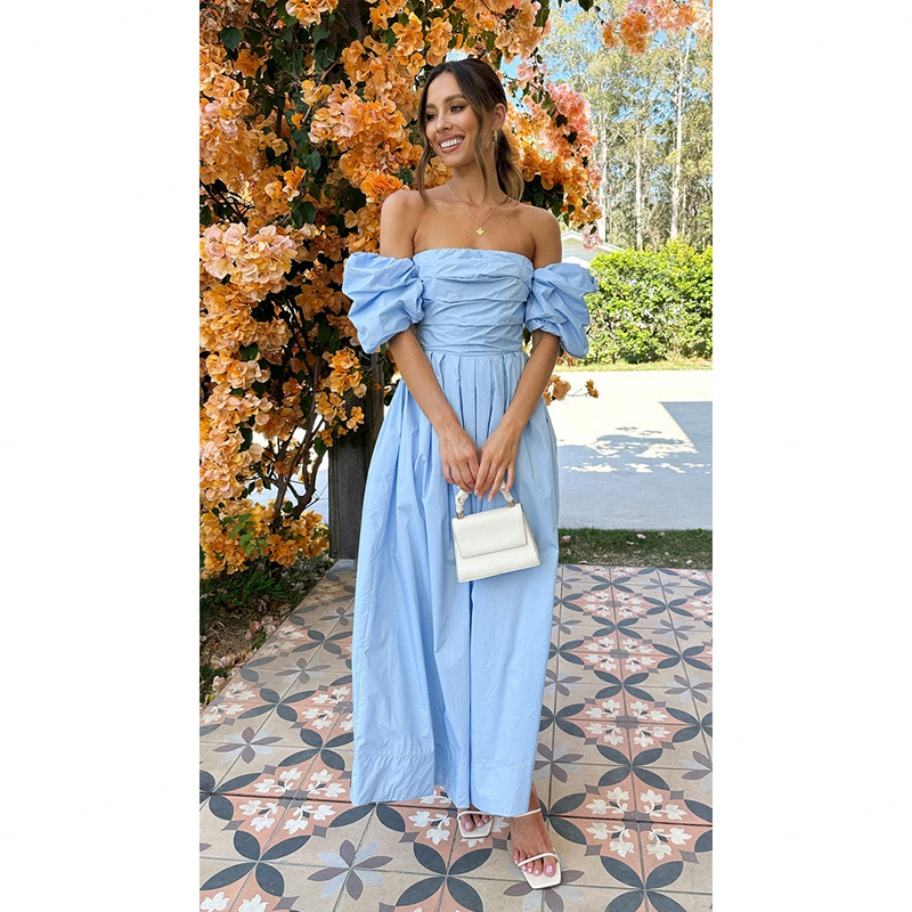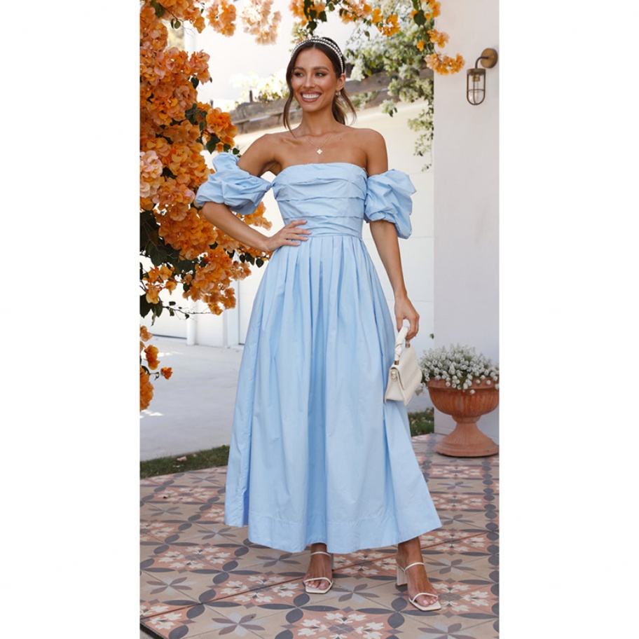 เดรสสไตล์เจ้าหญิงสีฟ้าอ่อนแบบเปิดไหล่ ผ้าลูกไม้รักษ์โลก ทรงเอ สำหรับฤดูใบไม้ผลิและฤดูใบไม้ร่วง