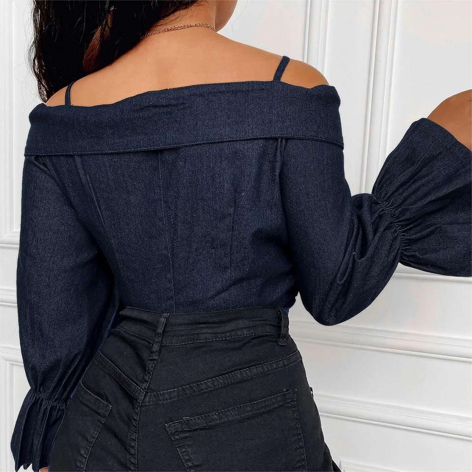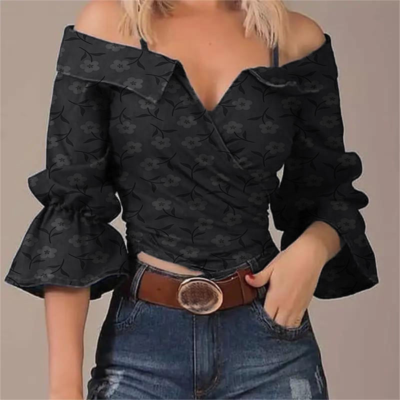 เสื้อแฟชั่นผู้หญิง แขนบาน คอวี สายคล้องคอ แบบเปิดไหล่ สไตล์สปริง/ออทั่ม
