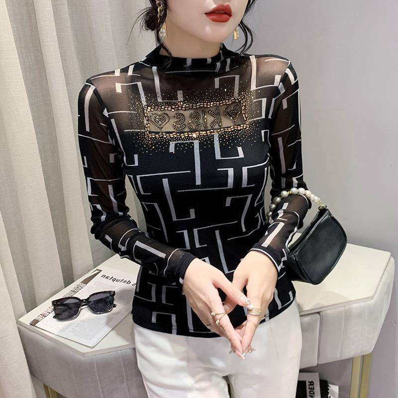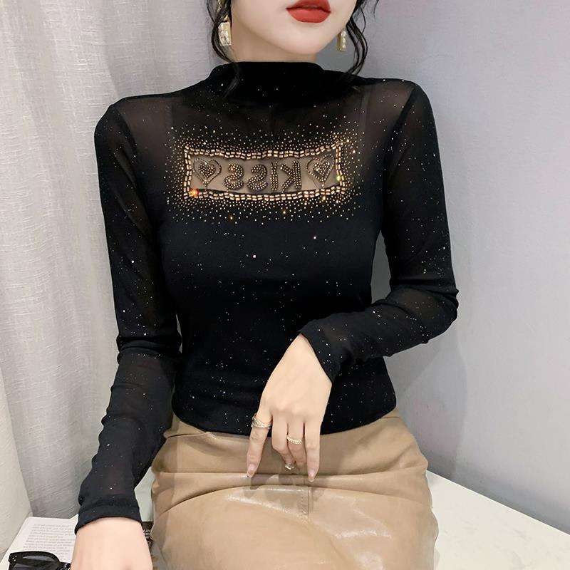 เสื้อคอเต่าแขนยาวสำหรับผู้หญิง, เสื้อคอเต่าครึ่งตัวอักษรพิมพ์ลายพลอยเทียมใหม่ฤดูใบไม้ผลิและฤดูใบไม้ร่วง