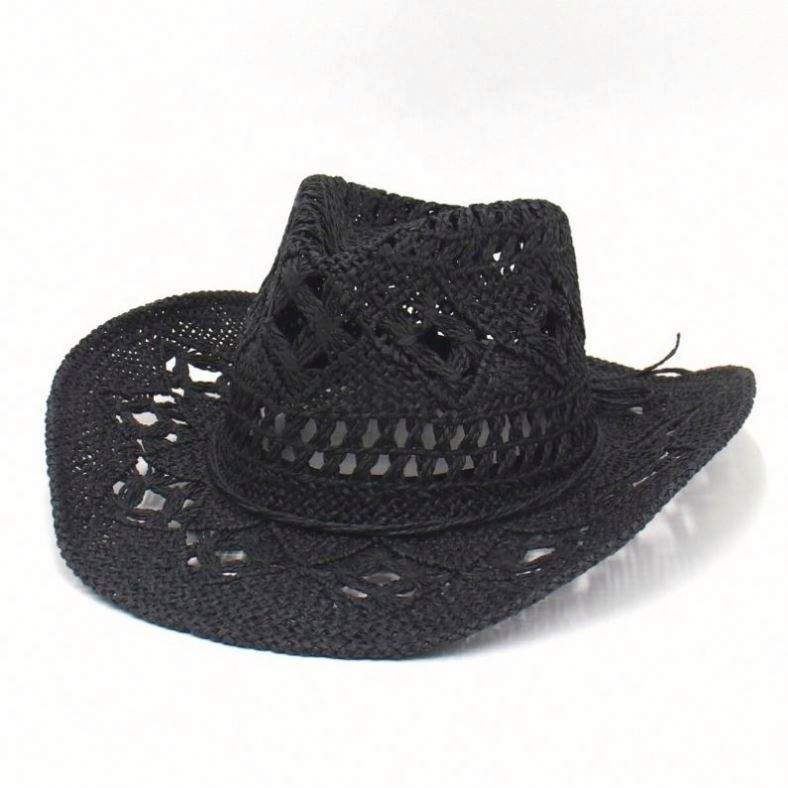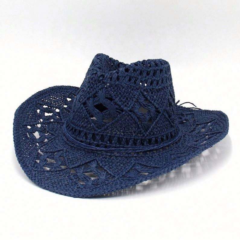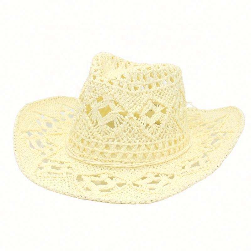 หมวกคาวบอยทรงกลวงสำหรับฤดูใบไม้ผลิและฤดูร้อน หมวกฟางสานมือ ระบายอากาศได้ดี หมวกสไตล์อเมริกันแจ๊ส