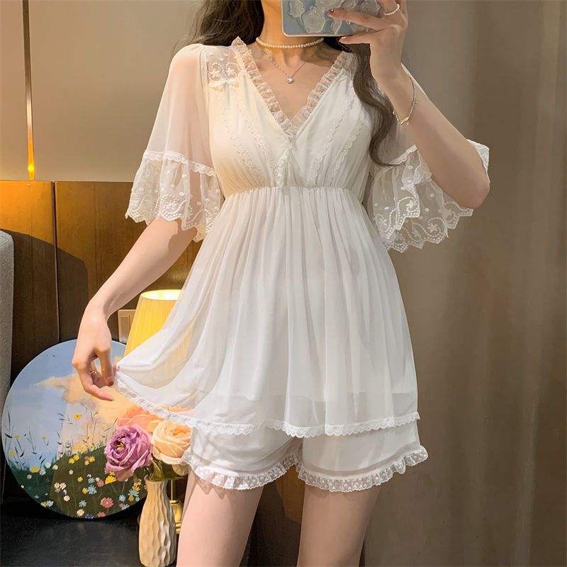 ชุดนอนแขนยาวสำหรับฤดูใบไม้ผลิและฤดูใบไม้ร่วงชุดนอนเจ้าหญิงวินเทจแขนสั้นคอกลมนางฟ้าสำหรับเด็กผู้หญิงใส่อยู่บ้านในฤดูร้อน