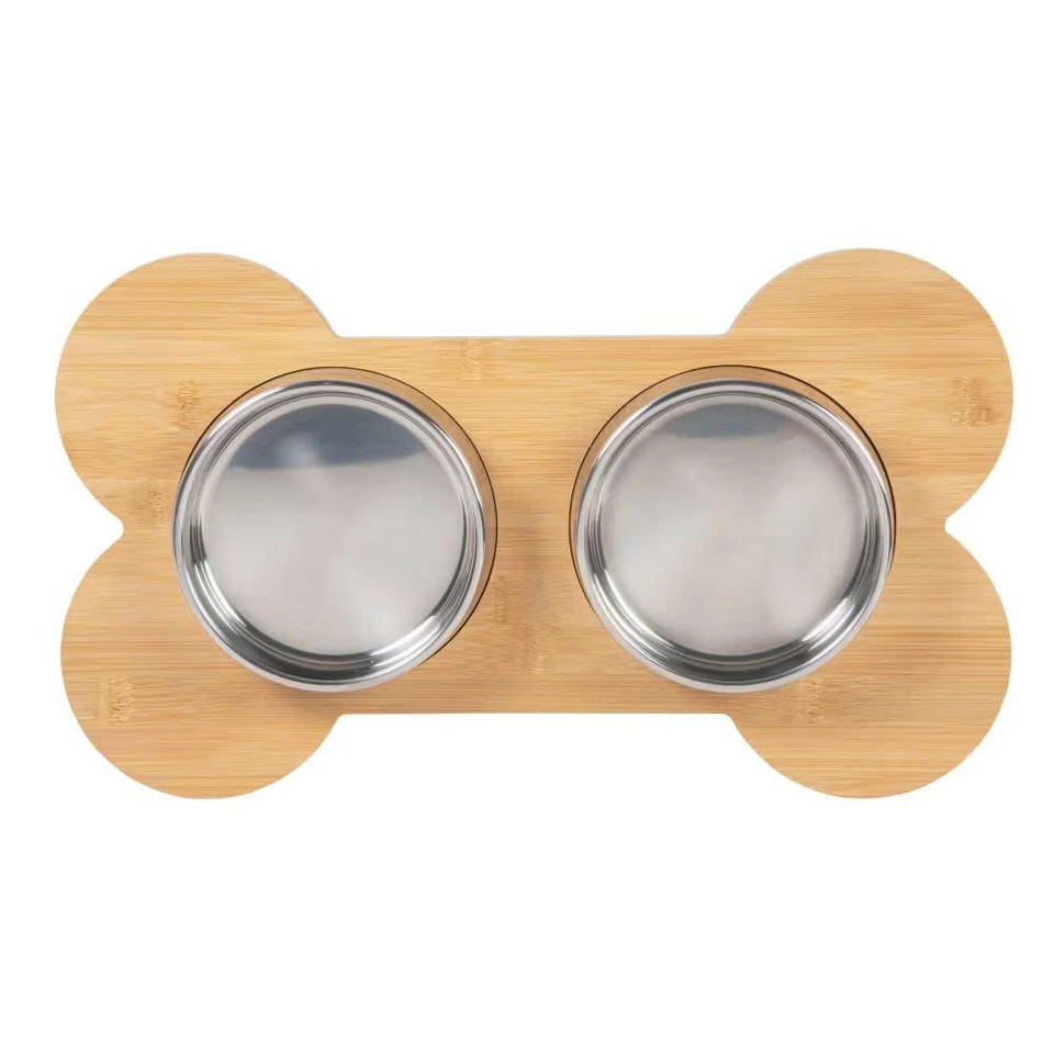 ชามอาหารสัตว์เลี้ยงไม้ไผ่แบบหมุนสองช่อง พร้อมชามสแตนเลสสำหรับสุนัขและแมว ผลิตจากไม้ไผ่ธรรมชาติ ขายส่งจากโรงงาน