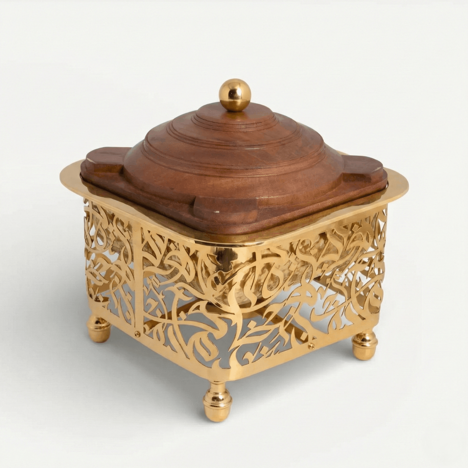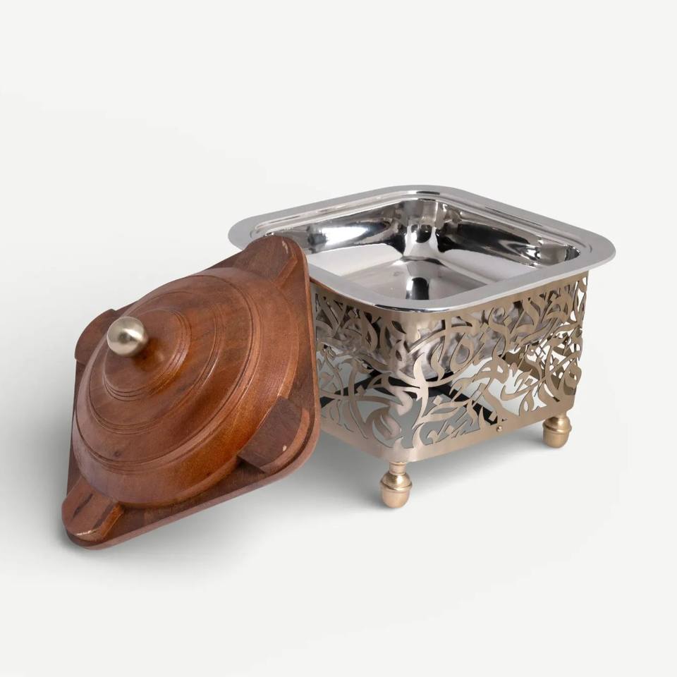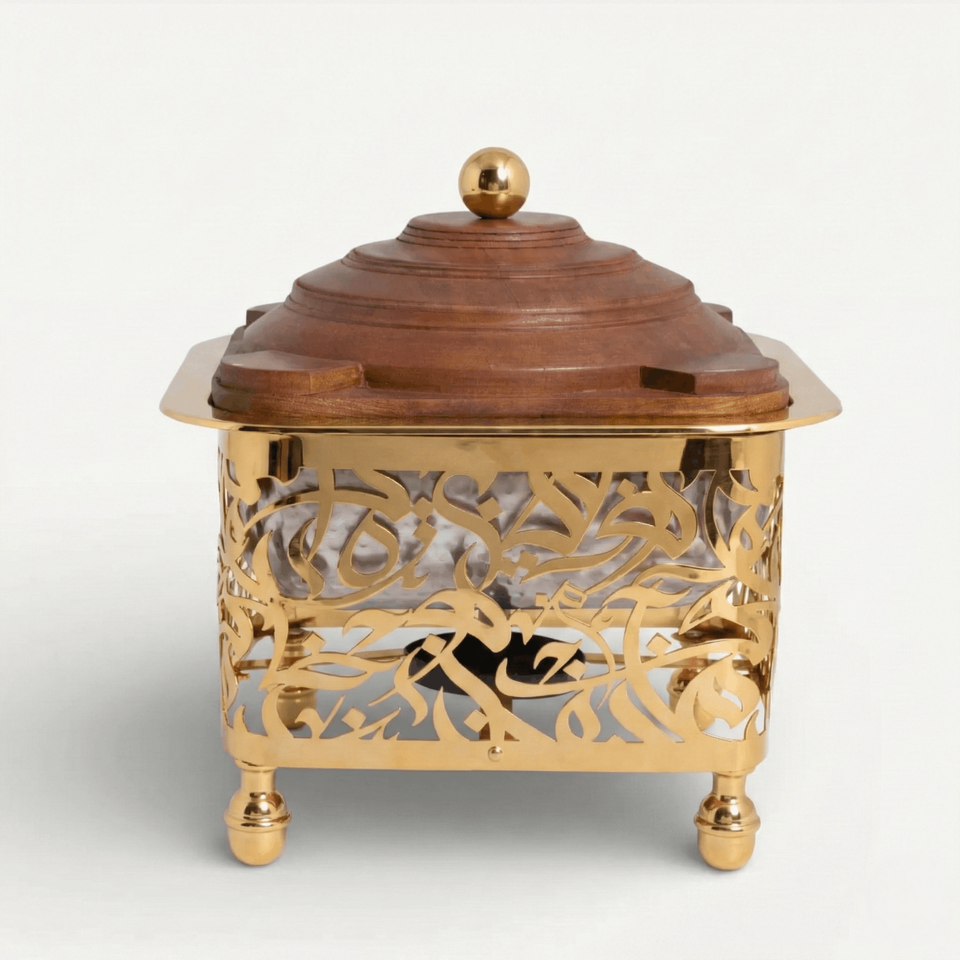 ถาดอุ่นอาหารทรงสี่เหลี่ยมลายฉลุพร้อมฝาปิดทรงปิรามิดไม้ทำมือและเคลือบทองเหลืองสำหรับงานจัดเลี้ยงบุฟเฟ่ต์สุดหรู