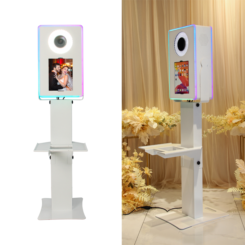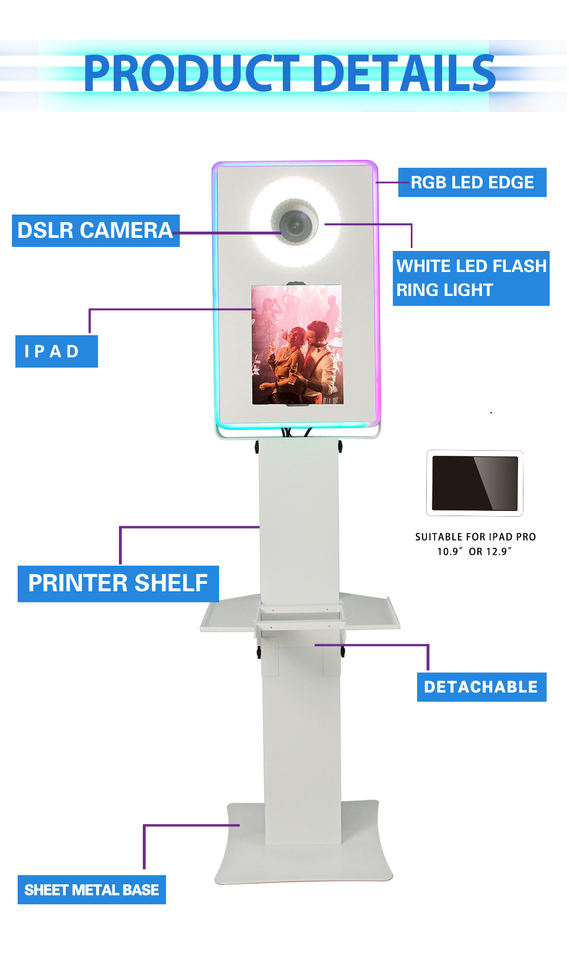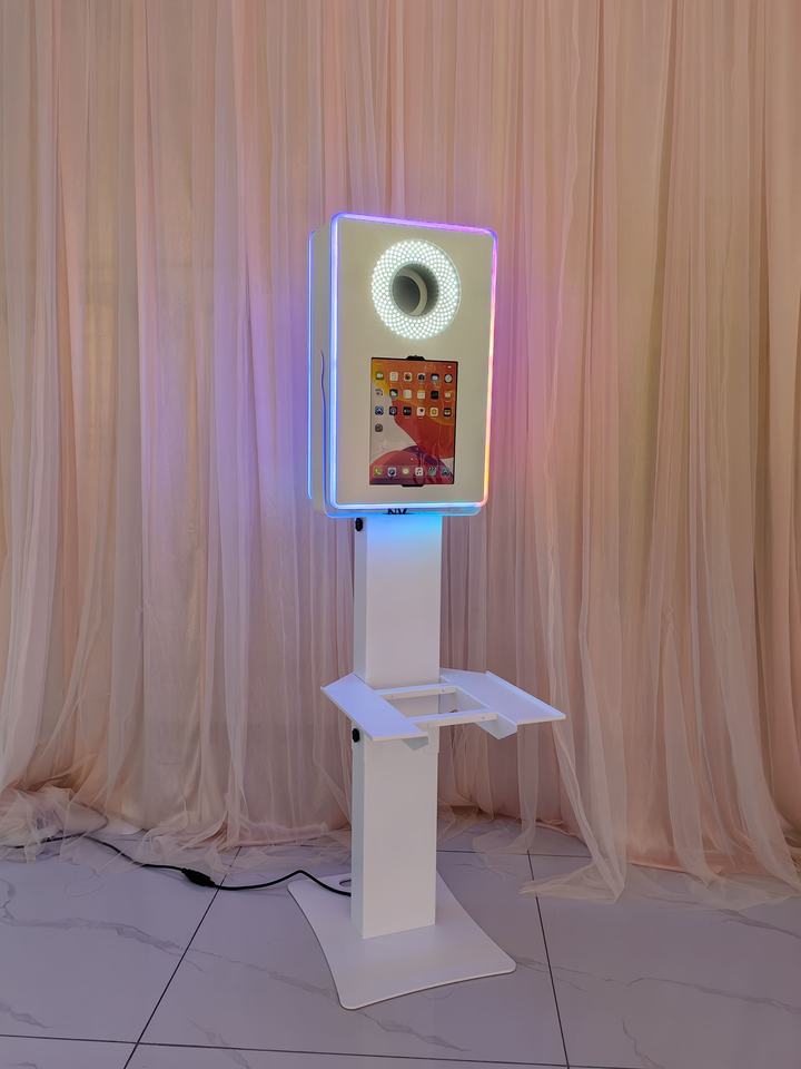 ตู้ถ่ายรูปงานอีเว้นท์แบบสี่เหลี่ยม พร้อมแท่นวางเซลฟี่ Surface Pro DSLR พร้อมไฟ RGB และชั้นวางเครื่องพิมพ์ สำหรับงานแต่งงานและงานปาร์ตี้