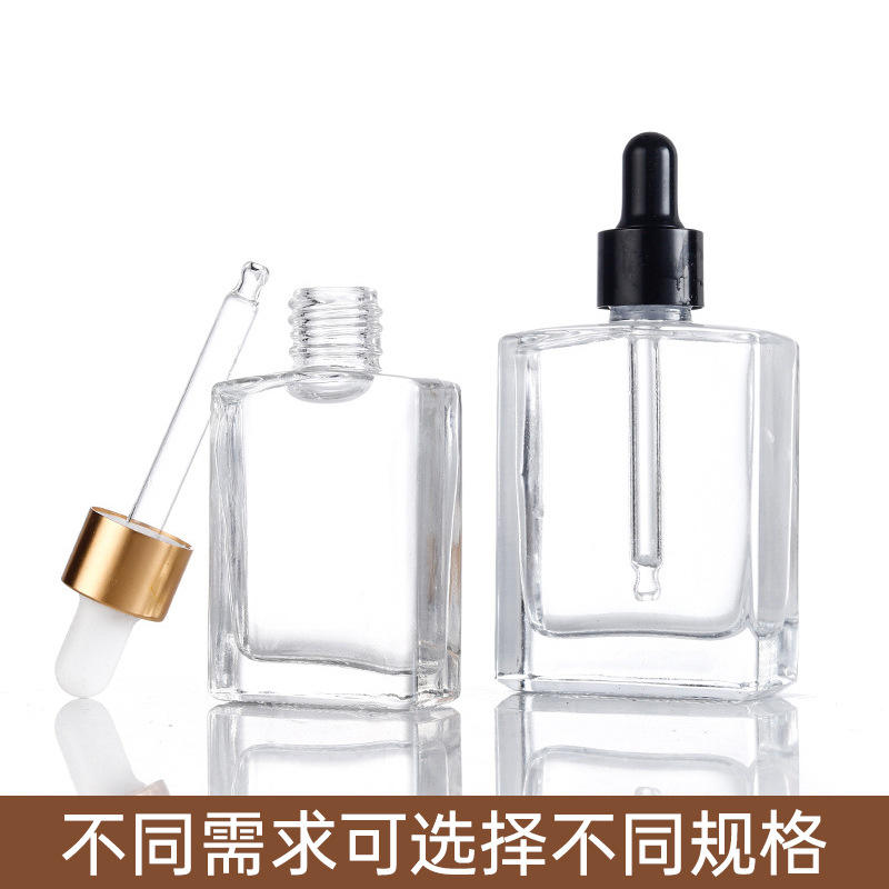 ขวดแก้วหยดทรงเหลี่ยมใส 30 มล. สำหรับเก็บเซรั่มเครื่องสำอางแบบเปล่า พร้อมปิเปต