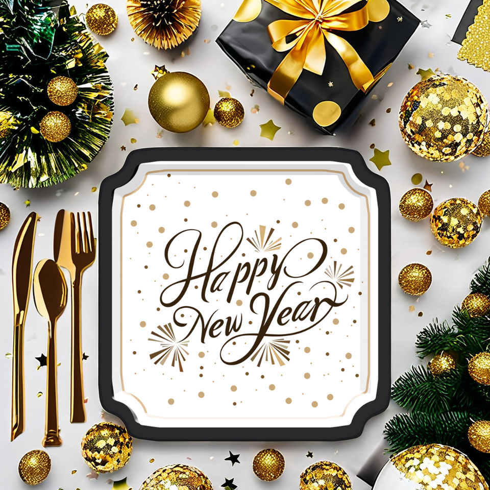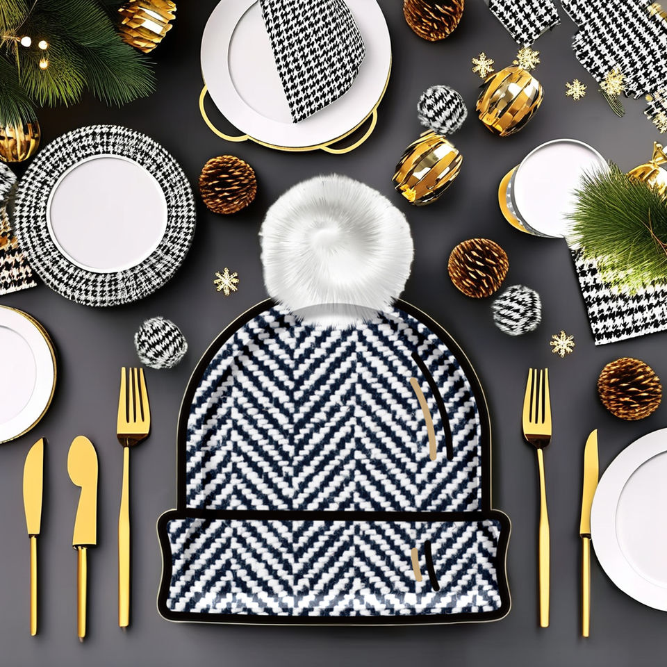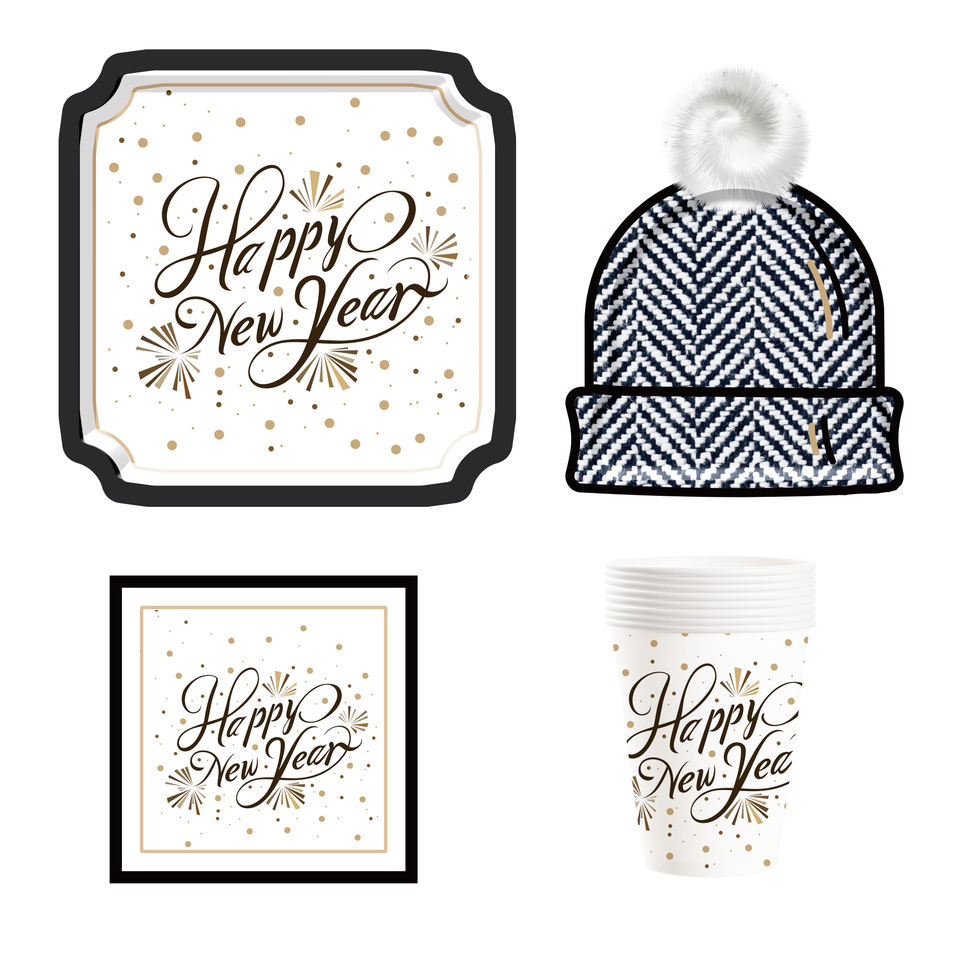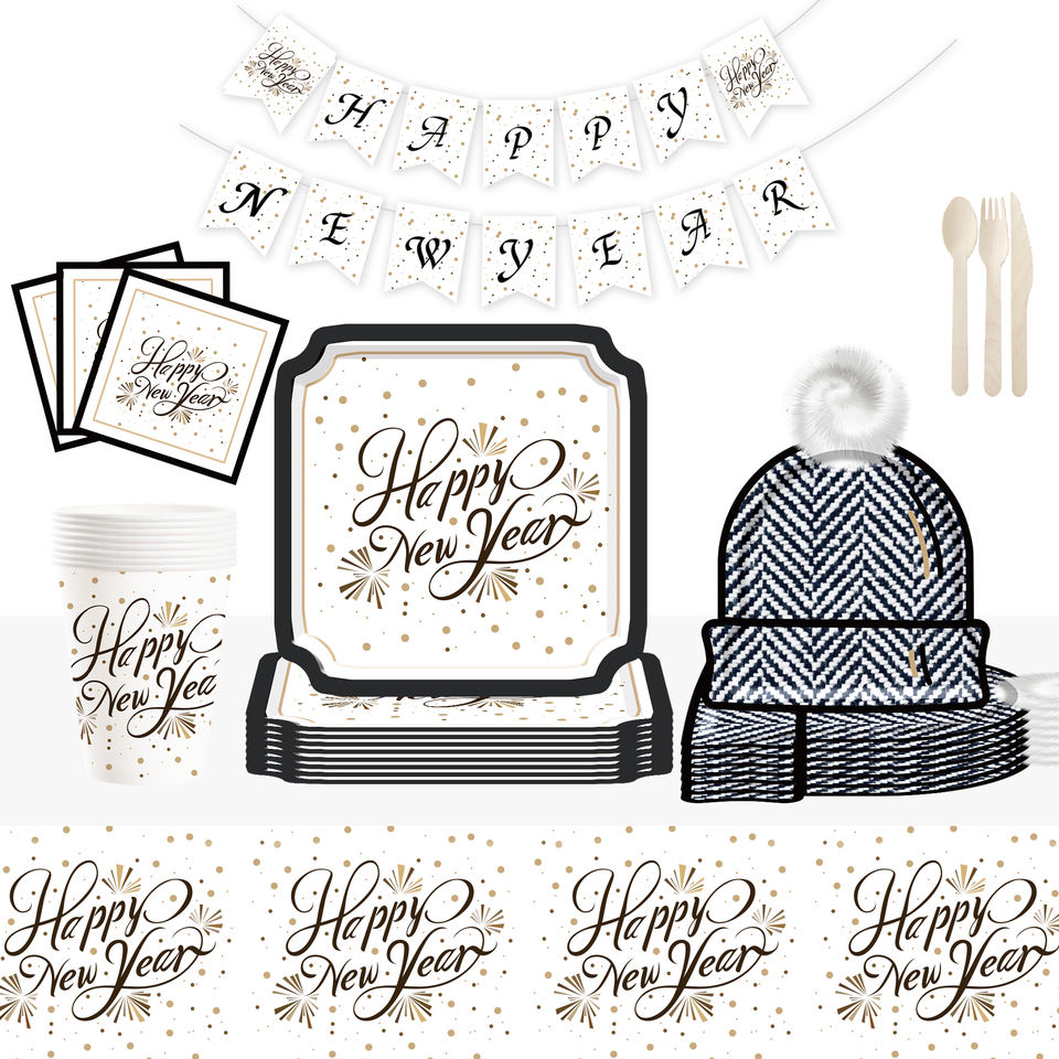 ชุดอุปกรณ์จัดงานเลี้ยงรูปทรงหมวกสี่เหลี่ยม ชุดจานชามกระดาษแบบใช้แล้วทิ้ง ชุดอุปกรณ์บนโต๊ะอาหารสำหรับงานเลี้ยง กระดาษเช็ดปาก แก้ว จาน ของตกแต่งปีใหม่