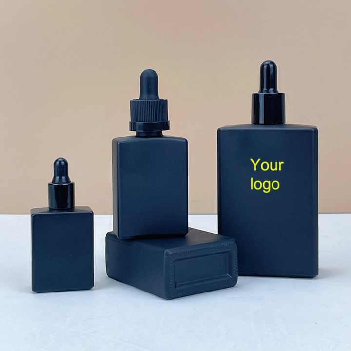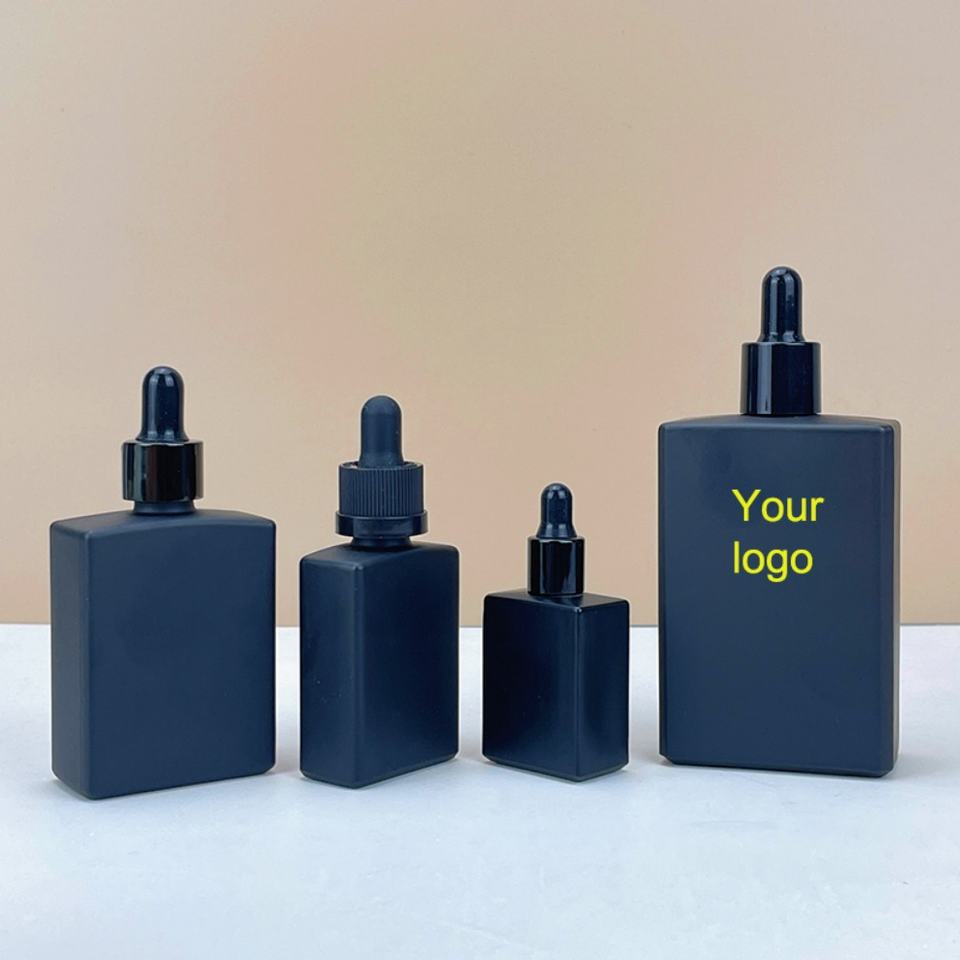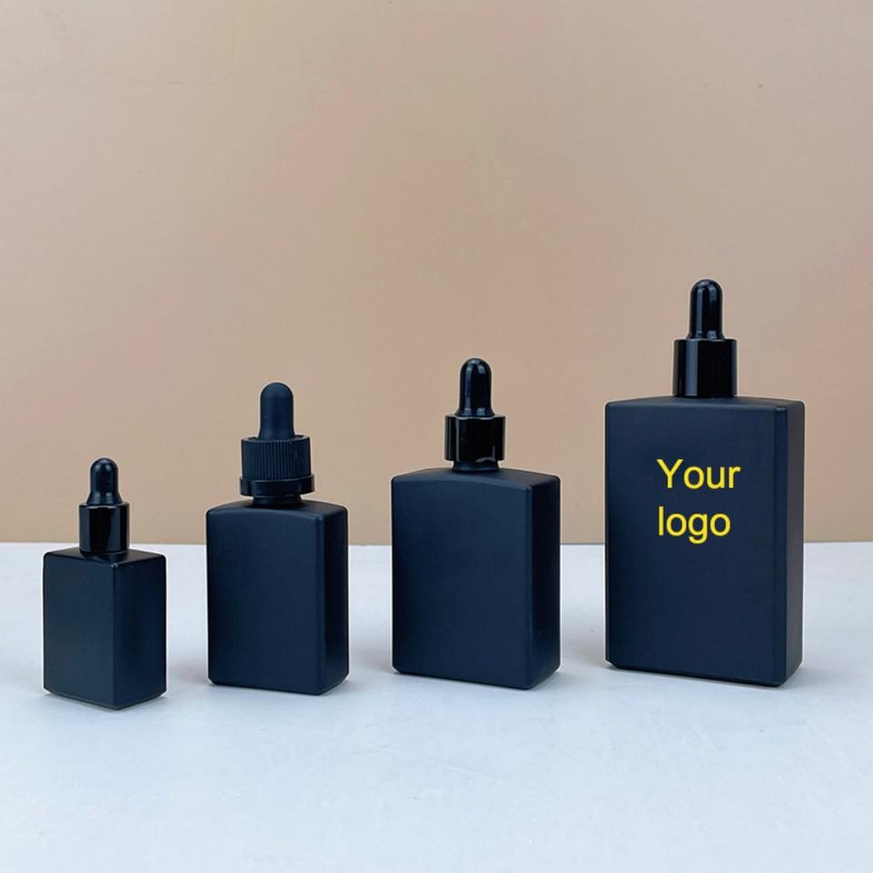 ขวดแก้วสี่เหลี่ยมสีดำด้านสำหรับน้ำมันหอมระเหย น้ำมันสำหรับเครา ขนาด 15 มล. 30 มล. 50 มล. 100 มล. ขวดแก้วทรงสี่เหลี่ยมผืนผ้าแบบมีหลอดหยด