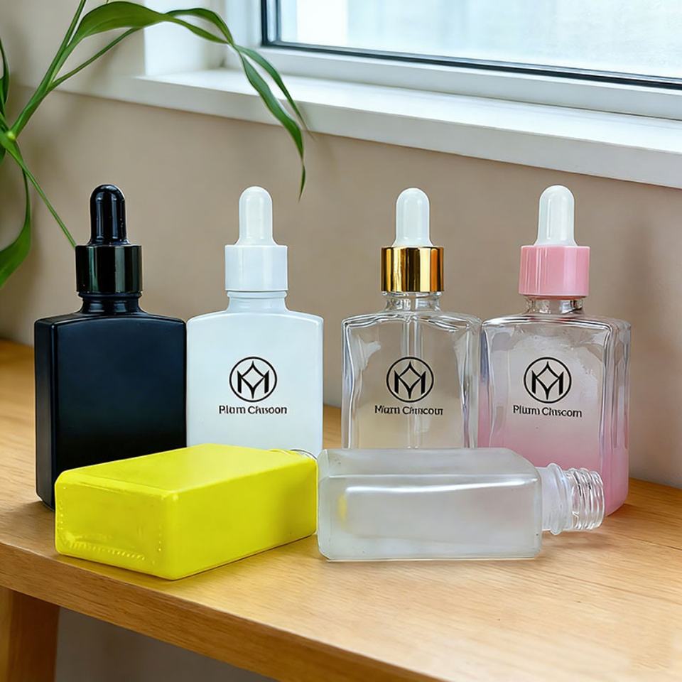 ขวดแก้วเครื่องสำอาง, ขวดเซรั่มแก้วทรงเหลี่ยม, ขวดดรอปเปอร์แก้ว