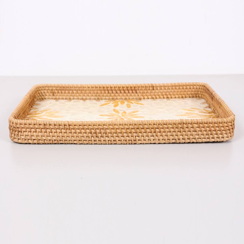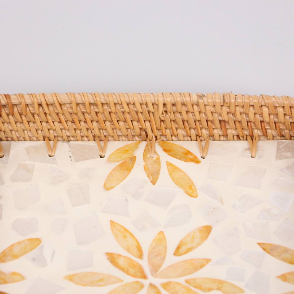 ถาดวางโต๊ะประดับมุกลายดอกไม้สีเหลืองถาดเสิร์ฟตกแต่งขอบหวายอเนกประสงค์ของขวัญบนโต๊ะรับประทานอาหารในห้องครัว