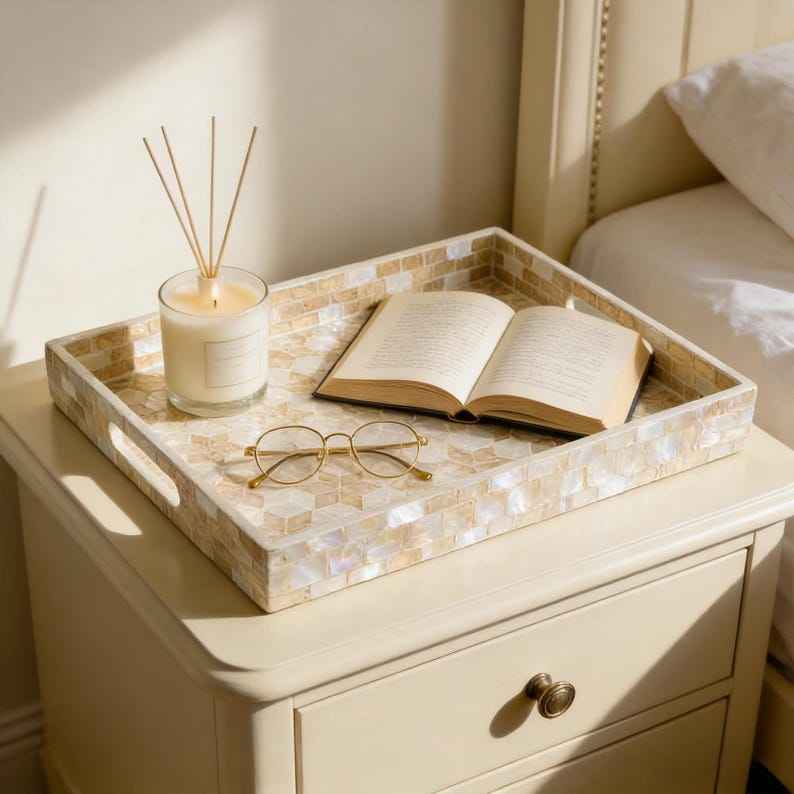ถาดฝังมุกทรงสี่เหลี่ยม ถาดเปลือกหอยธรรมชาติพร้อมหูจับและฐานกันลื่น เหมาะสำหรับใส่ผลไม้ ขนมปัง อาหารเช้า โต๊ะกาแฟ