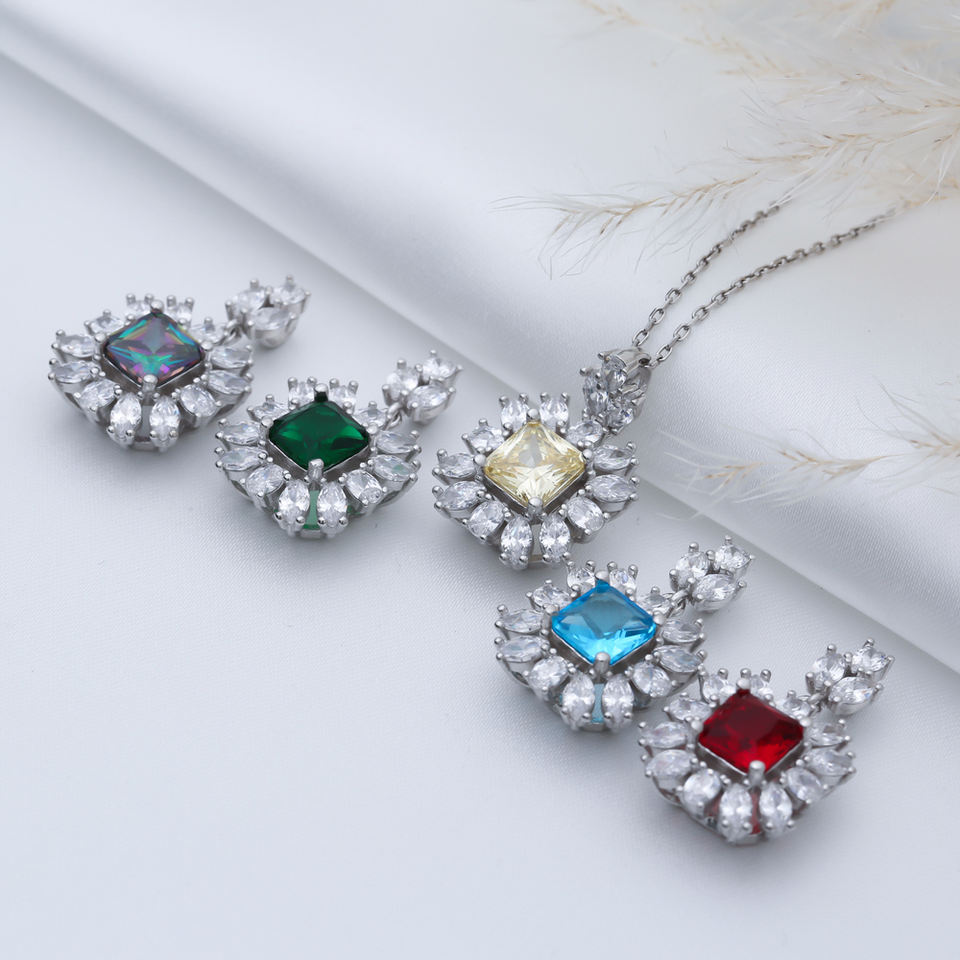 สร้อยคอเพชรโทแพซสี่เหลี่ยมหิน CZ ดีไซน์ดอกไม้สร้อยคอเงินทำมือ925ขายส่ง