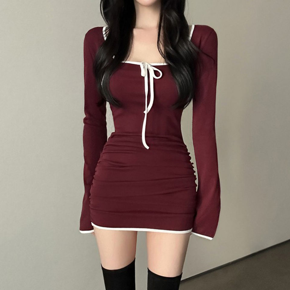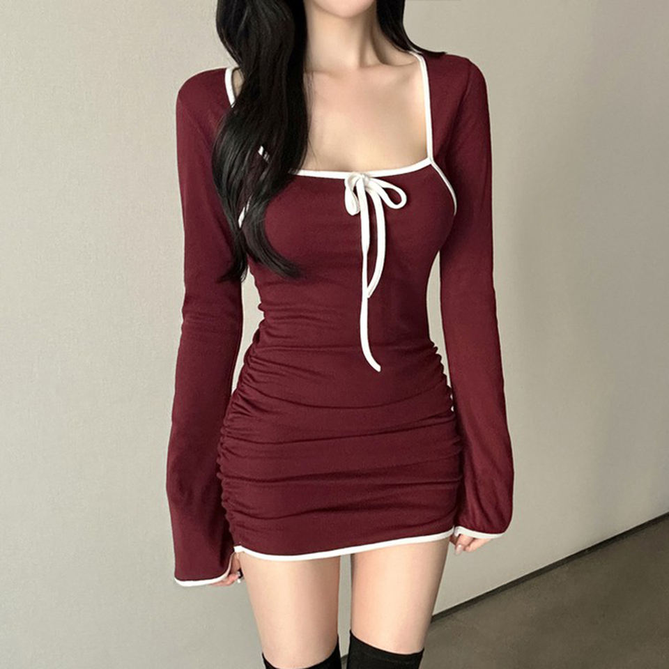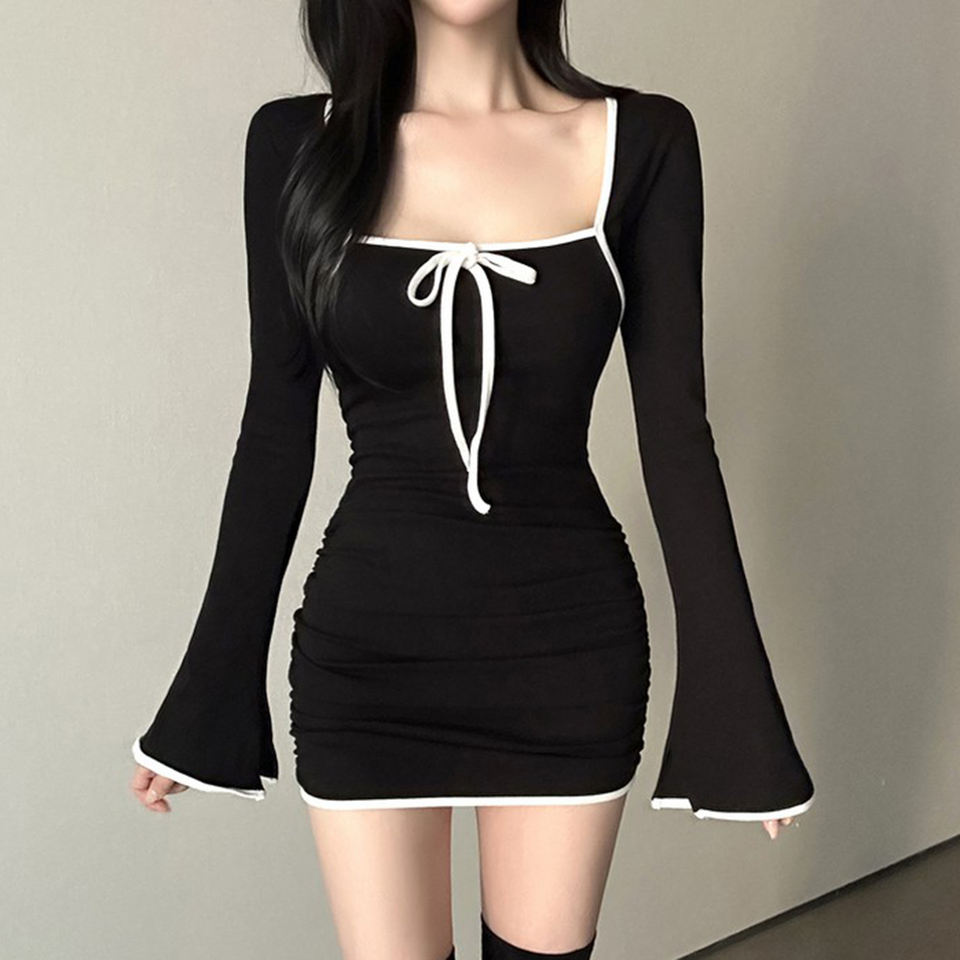 เดรสคอเหลี่ยมผู้หญิงสไตล์เกาหลี แขนกระดิ่งตัดสี ชุดเดรสสั้นผูกเอวทรงเข้ารูปสวยหรู
