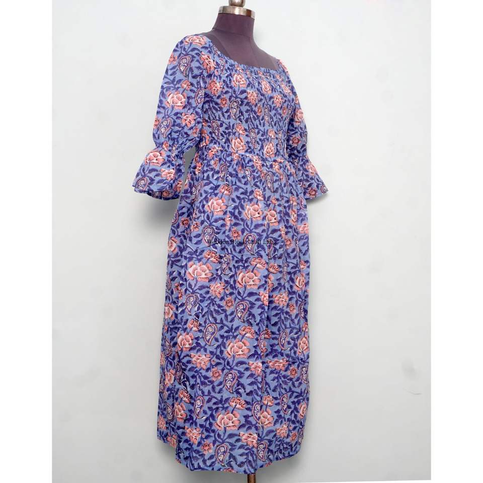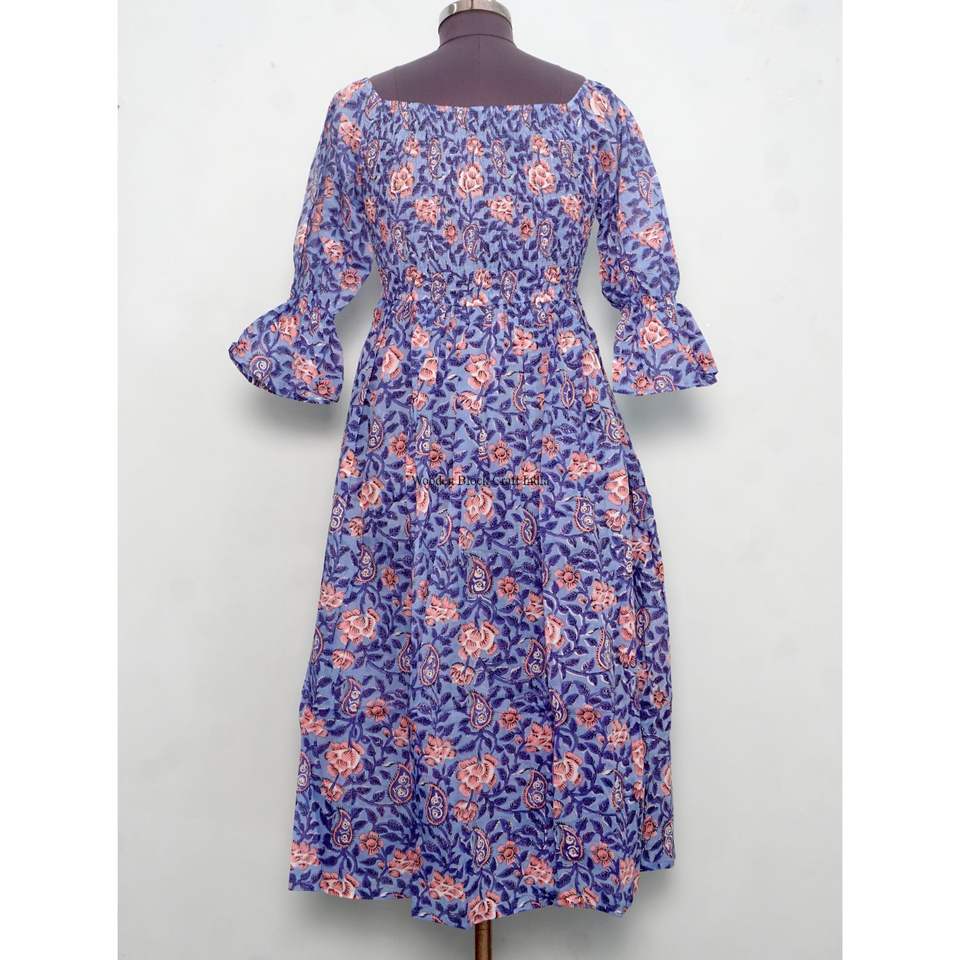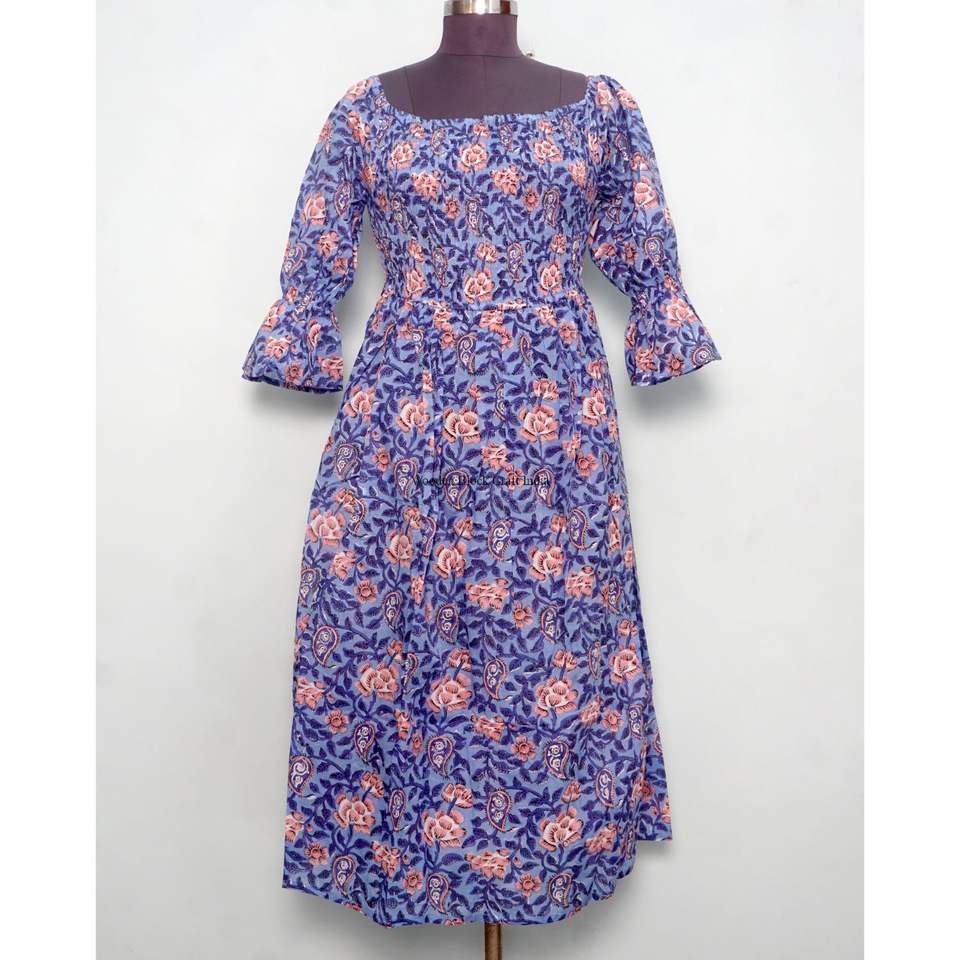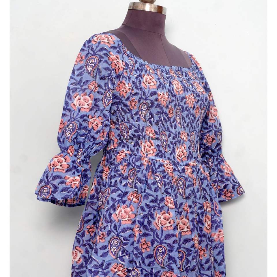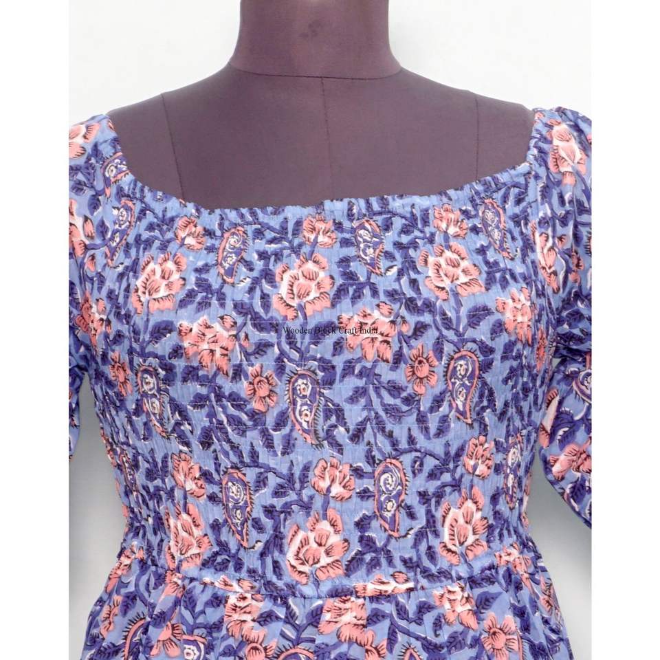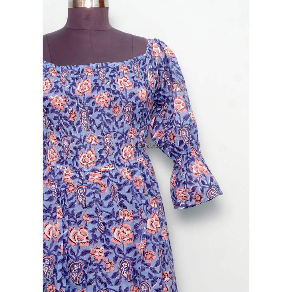 เดรสสั้นคอเหลี่ยมผ้าฝ้ายลายพิมพ์บล็อกมือแขนยาวลายดอกไม้สำหรับผู้หญิง