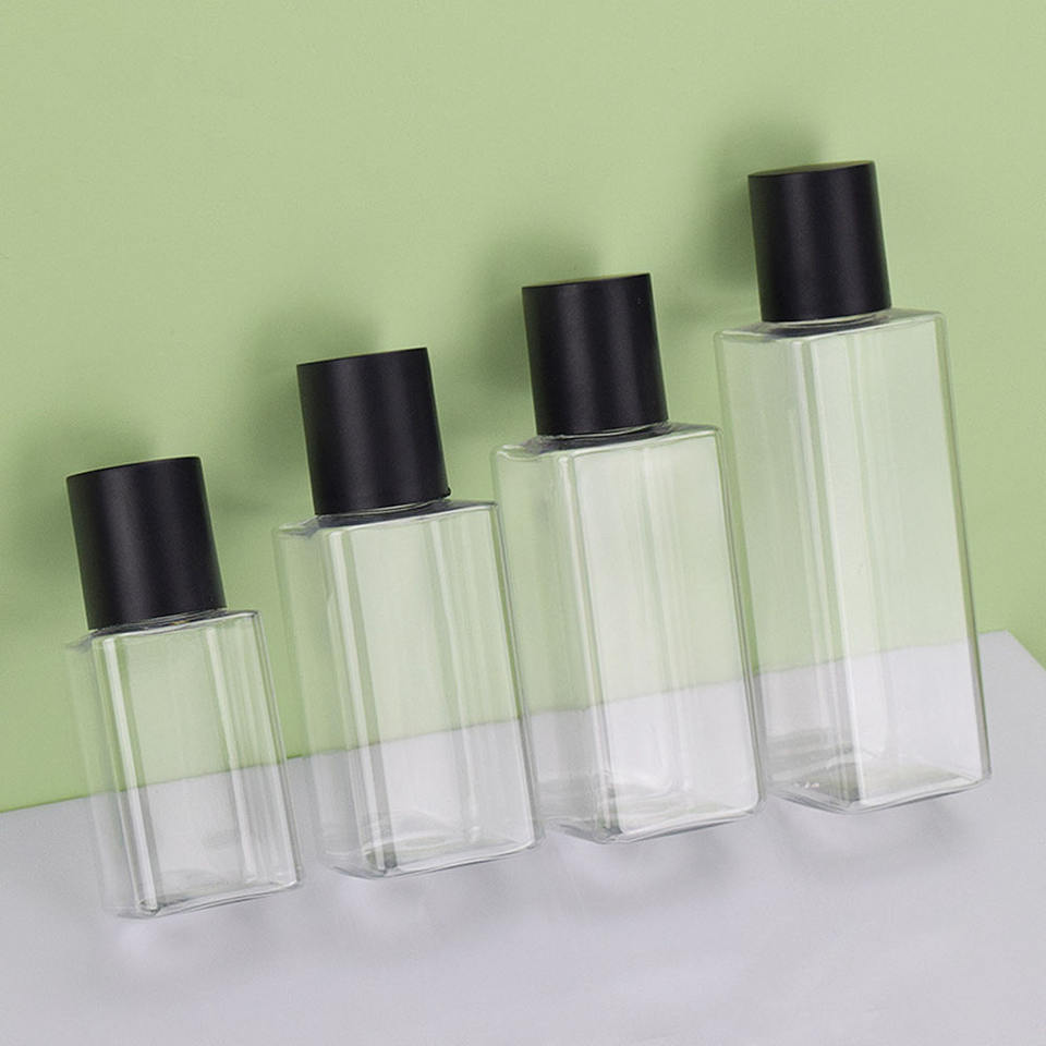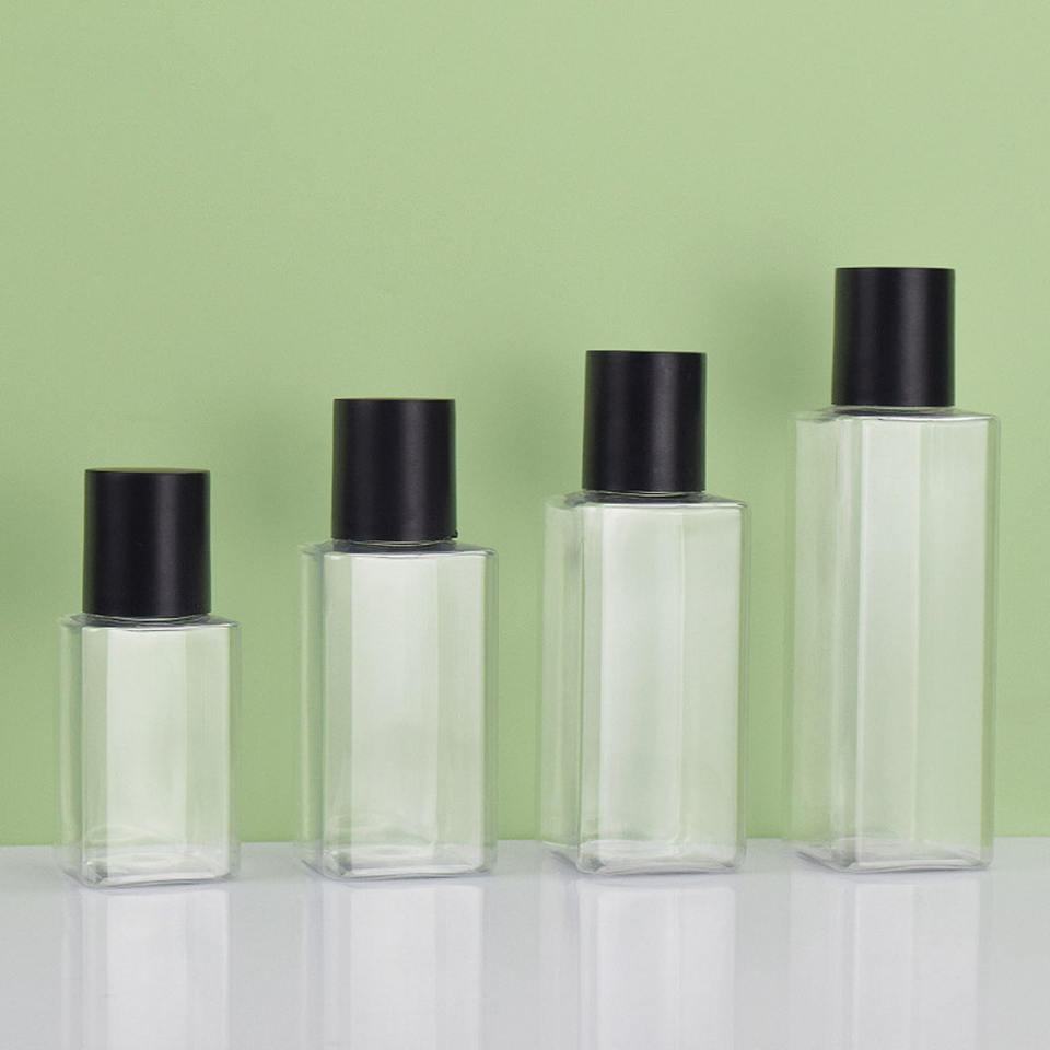 ขวดพลาสติก PET ทรงเหลี่ยม ขนาด 60 มล. 100 มล. 120 มล. 150 มล. 200 มล. พร้อมฝาเกลียว สำหรับบรรจุภัณฑ์ผลิตภัณฑ์บำรุงผิว โทนเนอร์ โลชั่น เครื่องสำอาง