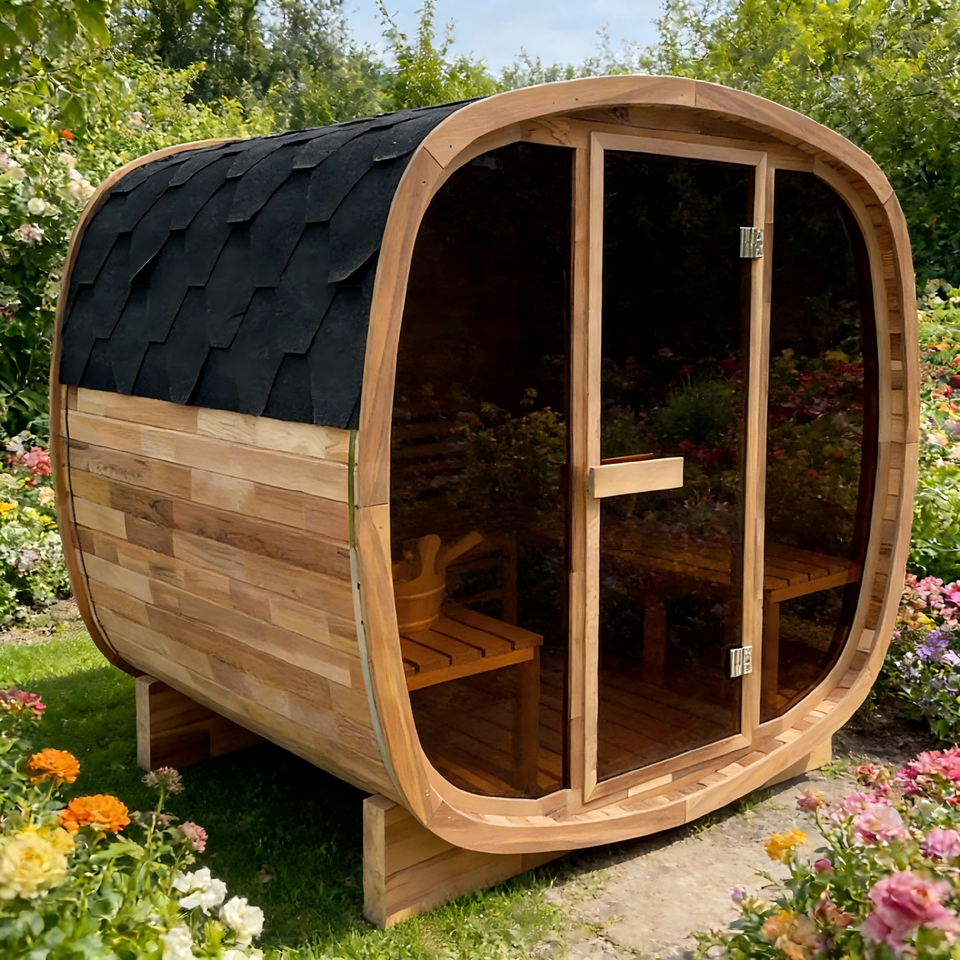 ห้องซาวน่าทรงสี่เหลี่ยมพร้อมเครื่องทำความร้อน 6 กิโลวัตต์ โครงสร้างไม้ซีดาร์แดง มีม้านั่งตรงข้ามและประตูกระจกนิรภัย