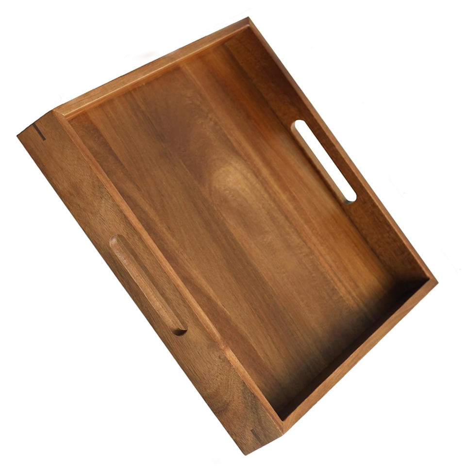 ถาดเสิร์ฟอาหารทรงสี่เหลี่ยมพร้อมด้ามจับถาดไม้อาคาเซียธรรมชาติสำหรับอาหารเช้างานเลี้ยงกาแฟใช้ตกแต่งโต๊ะรับประทานอาหารและโต๊ะกาแฟ