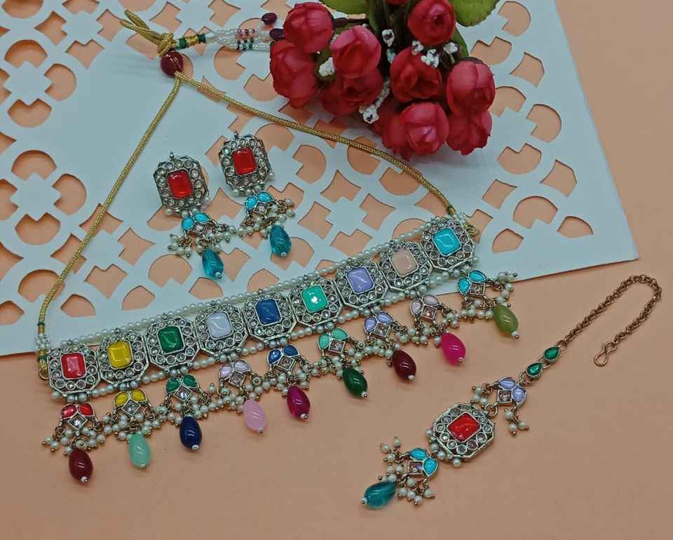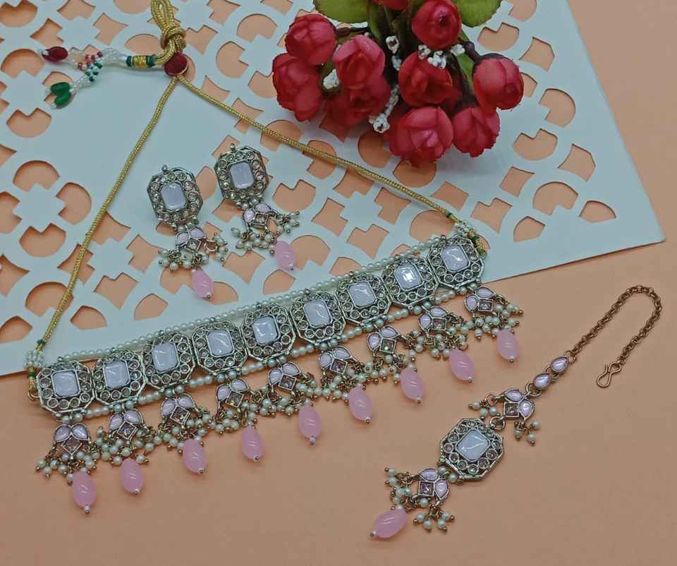 ชุดเครื่องประดับชุบทองและสร้อยคอทองแดงพร้อมชุดตุ้มหู mangtika สำหรับผู้หญิงดีไซน์รูปทรงสี่เหลี่ยมแบบดั้งเดิมของอินเดีย
