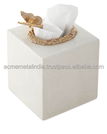 กล่องทิชชู่ทรงสี่เหลี่ยมจัตุรัสทำจากโลหะมีขอบทองเหลืองและสีขาวทองเหมาะสำหรับเครื่องใช้บนโต๊ะอาหารที่มีสไตล์และของตกแต่งบ้าน