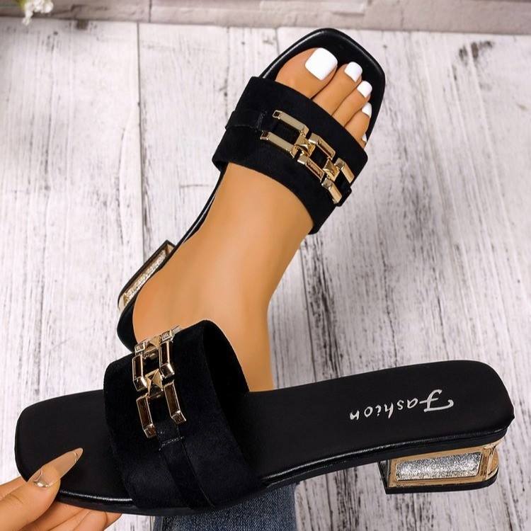รองเท้าส้นเตี้ยแบบสวมหัวเหลี่ยมประดับโซ่ สำหรับใส่ภายนอกบ้าน รุ่นใหม่ล่าสุดสำหรับฤดูร้อน ไซส์ใหญ่ ส้นหนา ขายส่ง