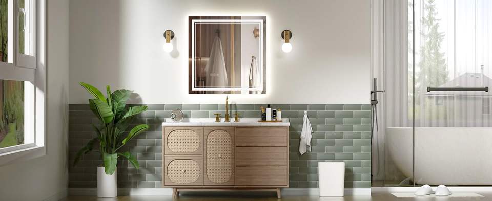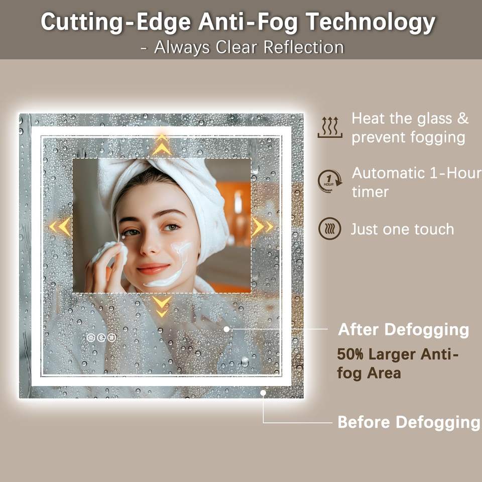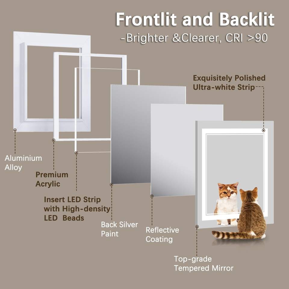 กระจกแต่งหน้าติดผนังหน้าจอสัมผัสสี่เหลี่ยมไฟ LED สำหรับร้านเสริมสวยโรงแรมสีขาวใส