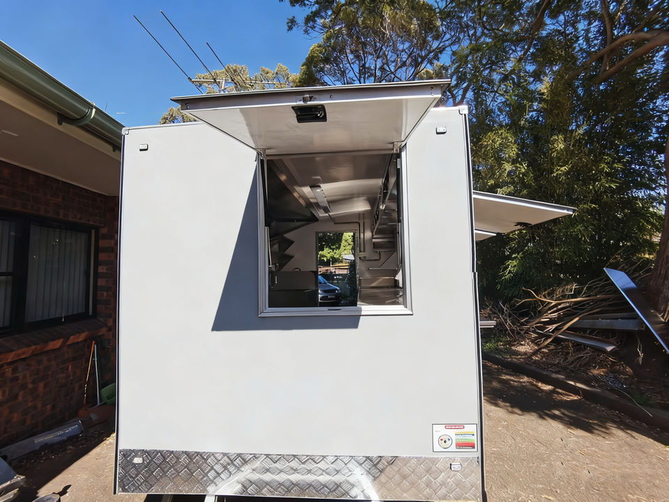 รถเข็นขายอาหารเช้าแบบลากจูงสีขาวทรงสี่เหลี่ยม - รถขายอาหารเคลื่อนที่อเนกประสงค์สำหรับขายอาหารจานด่วน ไอศกรีม ขนมขบเคี้ยว ทำจากสแตนเลส 4 ล้อ