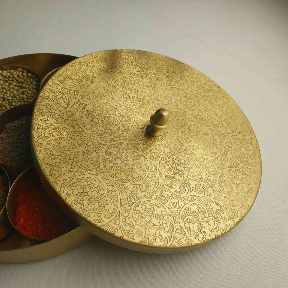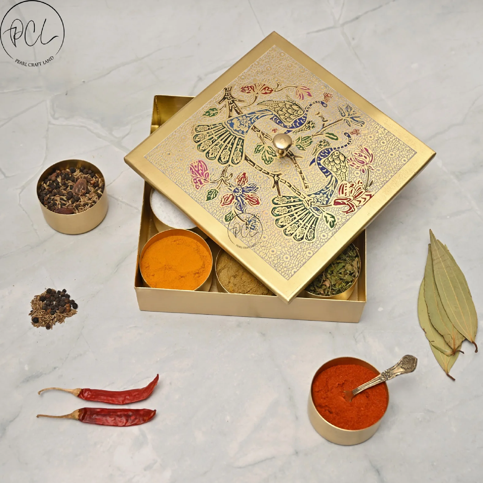 กล่องเครื่องเทศทองเหลืองทรงสี่เหลี่ยมพร้อมฝาปิดลายนกยูง ให้ความรู้สึกหรูหราสำหรับการจัดเก็บเครื่องเทศของคุณอย่างมีเสน่ห์ ราคาขายส่ง