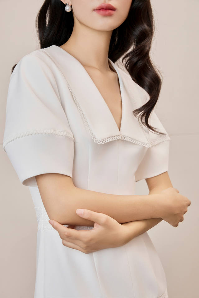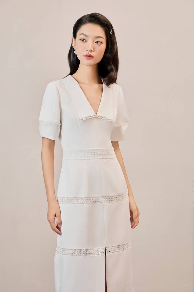 แฟชั่น ธาตุ:Square collar, lace panels, timeless white tone