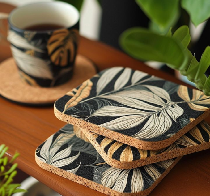 จานรองแก้วไม้ก๊อกทรงสี่เหลี่ยมมีพื้นหลังสีเข้มและลายใบไม้เขตร้อนที่มีชีวิตชีวามีจำหน่ายในราคาขายส่ง