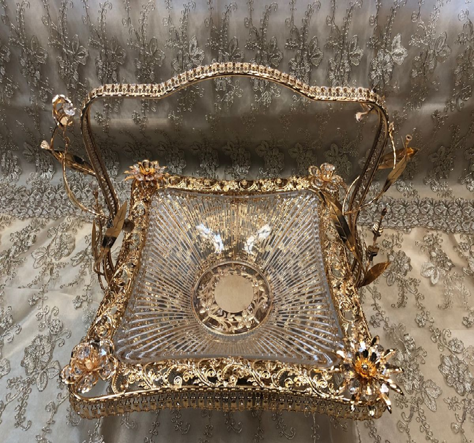 ชามแก้วใสทรงสี่เหลี่ยมประดับกรอบลายทองหนาพร้อมมุมลายดอกไม้; มีจำหน่ายในราคาขายส่ง