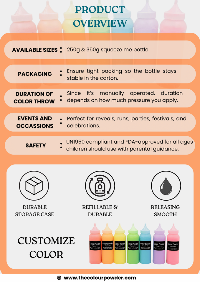 ขวดผงสีสควีซมีโฮลี | ผงสีสดใสปลอดภัยสำหรับงานปาร์ตี้ งานเฉลิมฉลอง และงานเฉลิมฉลองการเปิดเผยเพศลูก