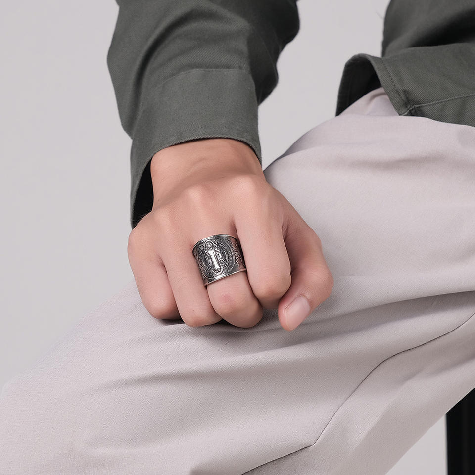 แหวนผู้ชายเซนต์เบเนดิกต์ ดีไซน์กางเขนทองเหลือง ของขวัญเครื่องประดับทางศาสนา