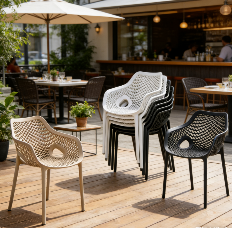 เก้าอี้กลางแจ้งแบบซ้อนได้สำหรับร้านอาหาร เก้าอี้พลาสติกทันสมัยสำหรับร้านกาแฟและสวน