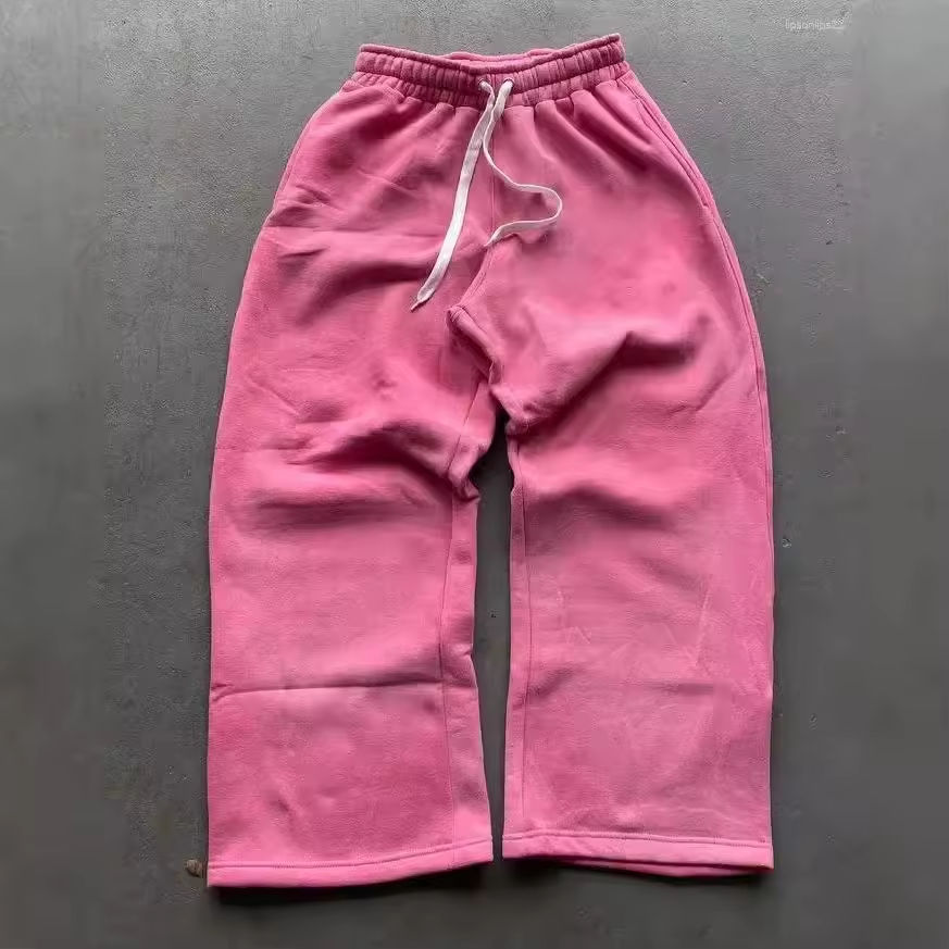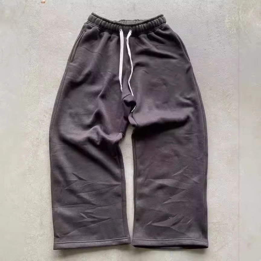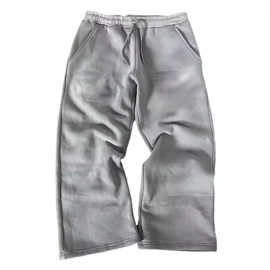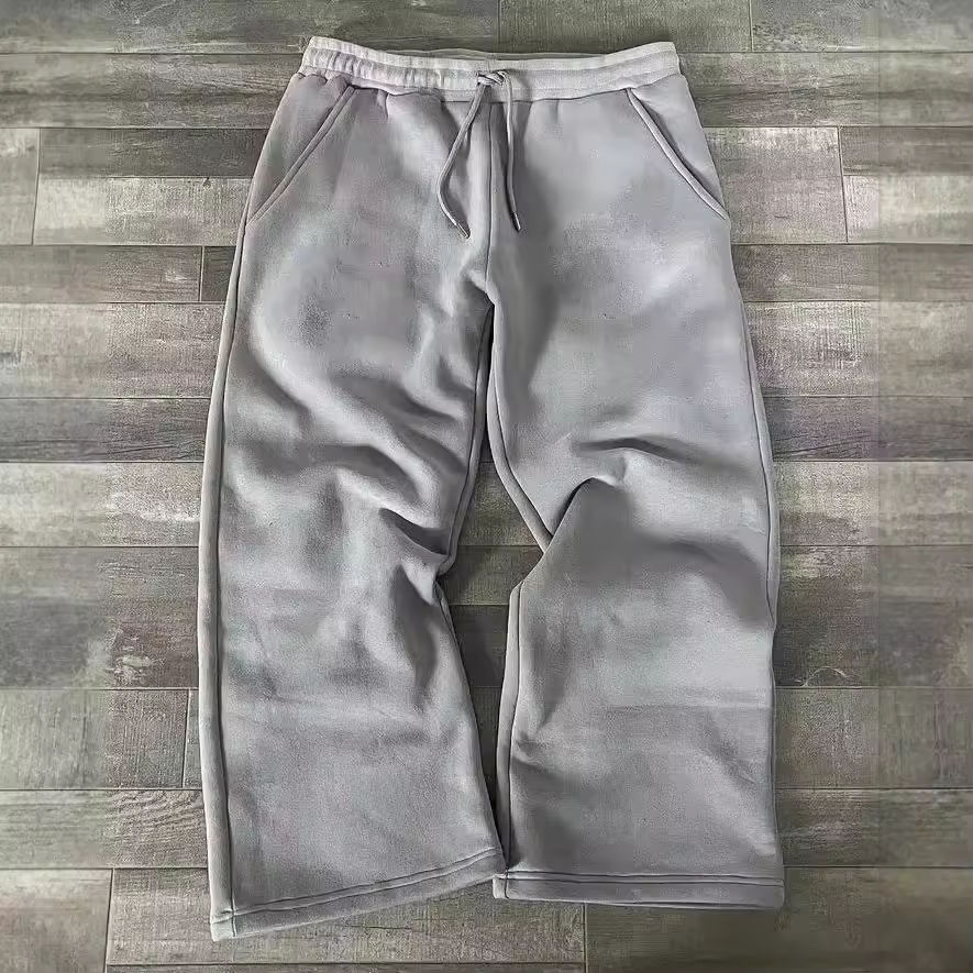 กางเกงวอร์มขาบานทรงตรงสำหรับผู้ชาย ปักลายตามสั่ง ผ้าฟลีซ ทรงวินเทจ ล้างสีแบบแอซิดวอช