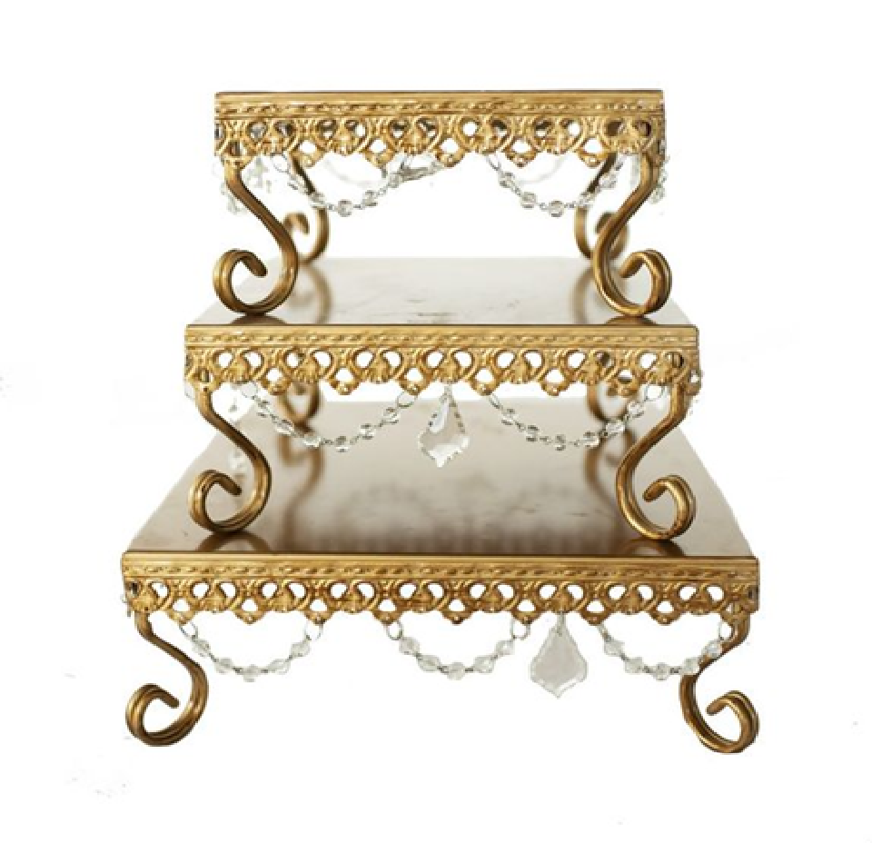 แท่นโชว์สี่เหลี่ยมสีทองแบบซ้อนกัน พร้อมขาแกะสลักและผ้าคริสตัลห้อยประดับ มีจำหน่ายในราคาขายส่ง