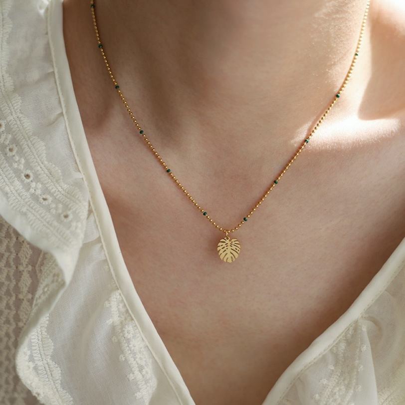 สร้อยคอจี้รูปใบไม้เล็กชุบทอง 18k สแตนเลส พร้อมลูกปัดกลม สายคล้องไหปลาร้า สำหรับผู้หญิง