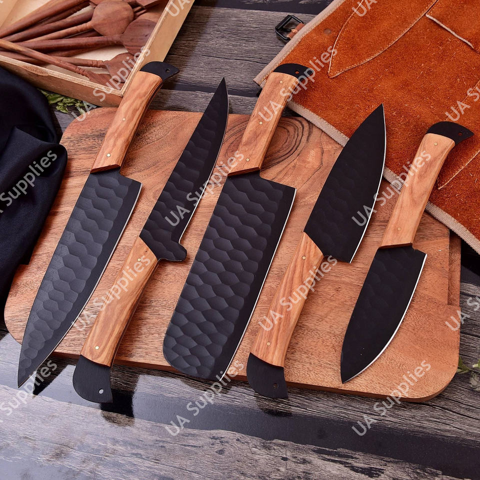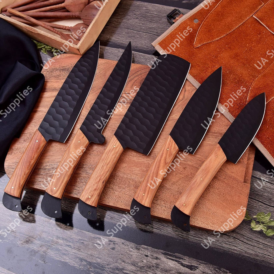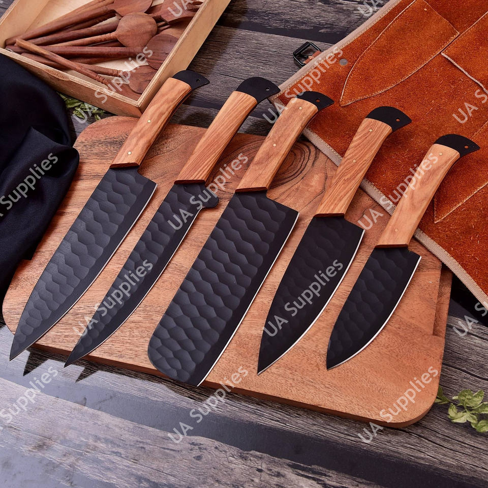 Stainless Steel 5 Pcs Brushed Finish Handmade Multipurpose BBQ Chef Set Olive Burl Ergonomic Handle Lightweight Full Tang
