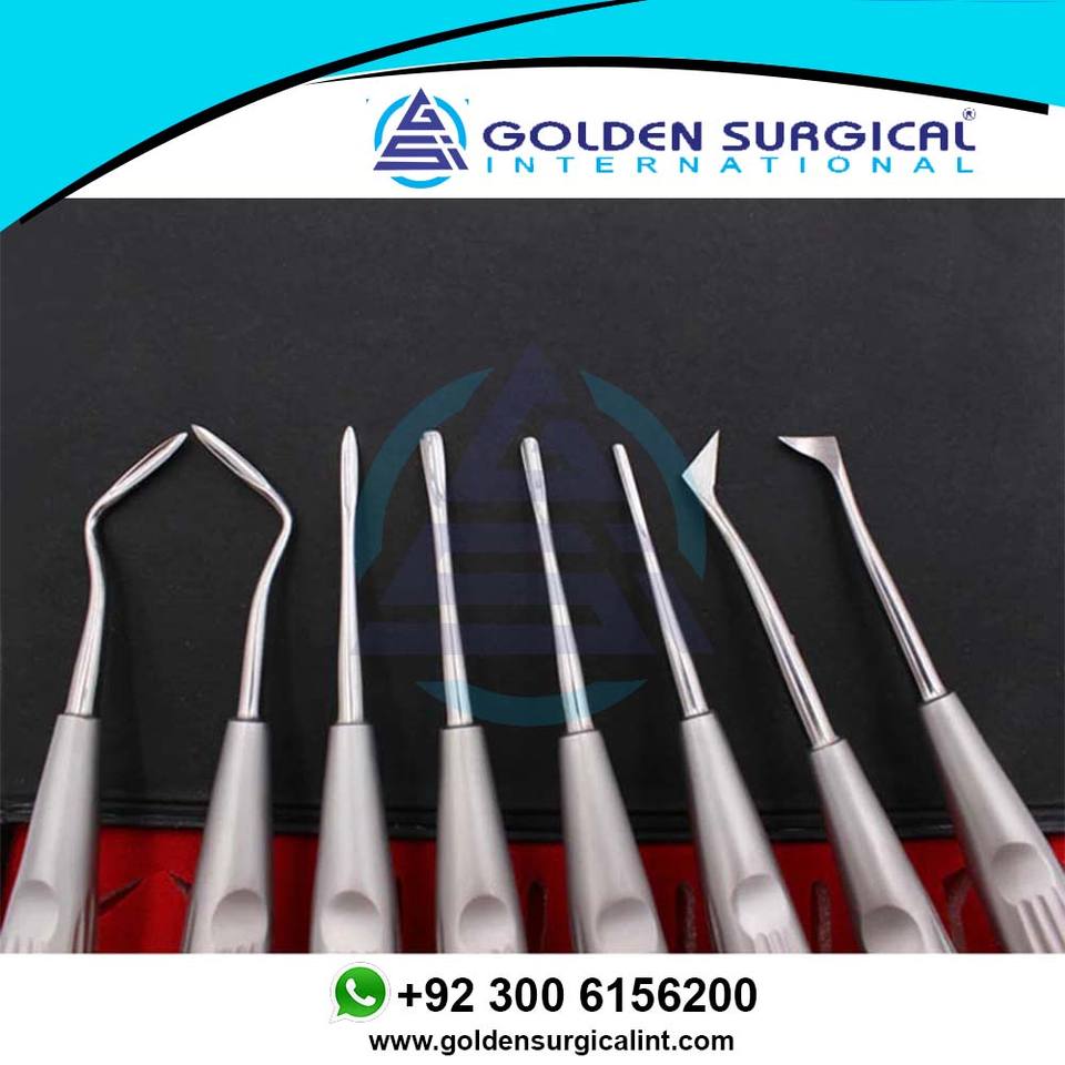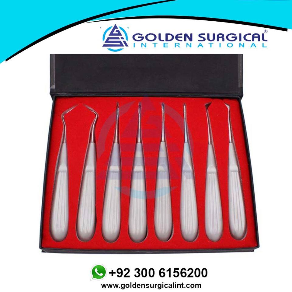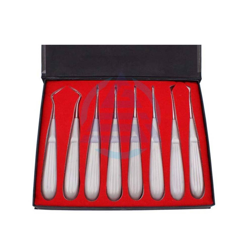 ชุดเครื่องมือถอนฟันสแตนเลส 8 ชิ้น พร้อมด้ามจับตามหลักสรีรศาสตร์ ประกอบด้วยเครื่องมือยกฟันโค้ง และไขควงผ่าตัด