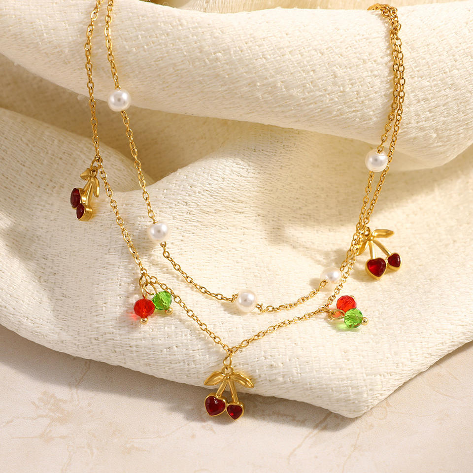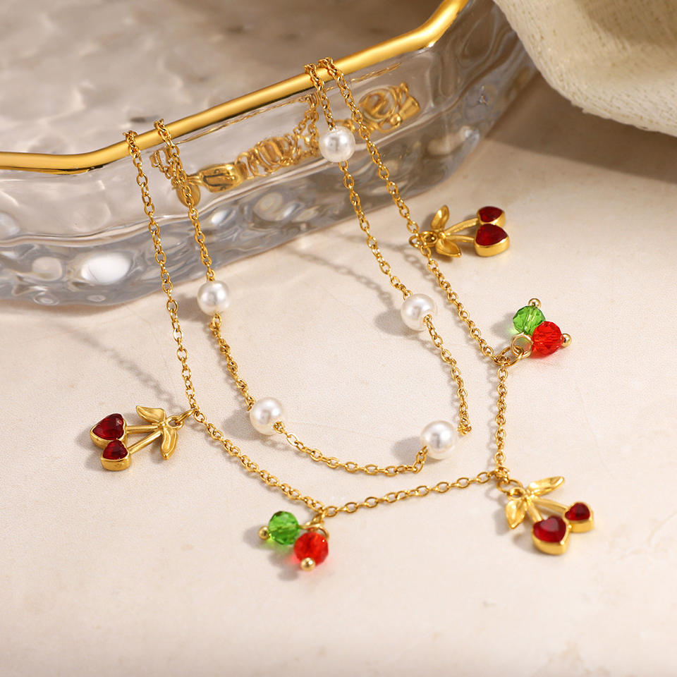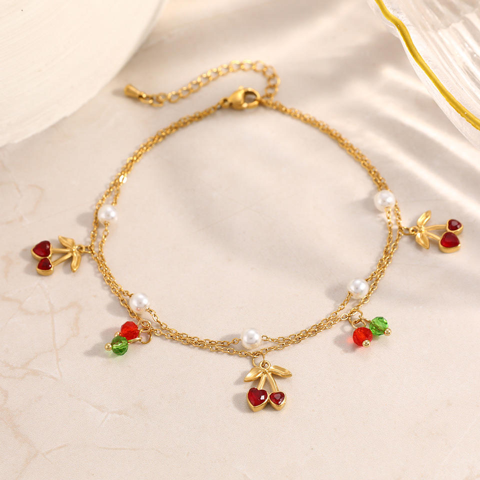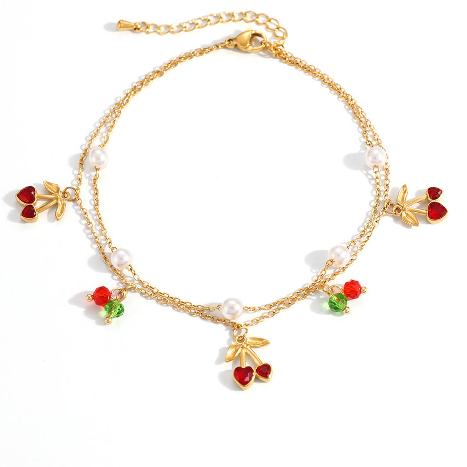 สร้อยข้อเท้าสแตนเลสสตีลสองชั้นประดับมุกเชอร์รี่ชุบทอง 18k เครื่องประดับเท้าสำหรับผู้หญิง