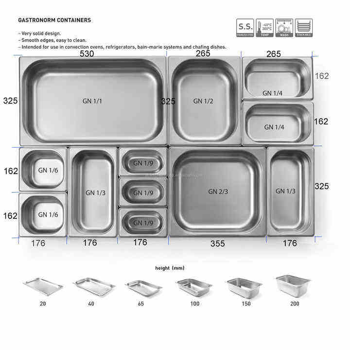 ภาชนะใส่อาหาร GN PAN สำหรับโรงแรมกันแยมสแตนเลสสตีล1/2X6 5/100/125/200มม.