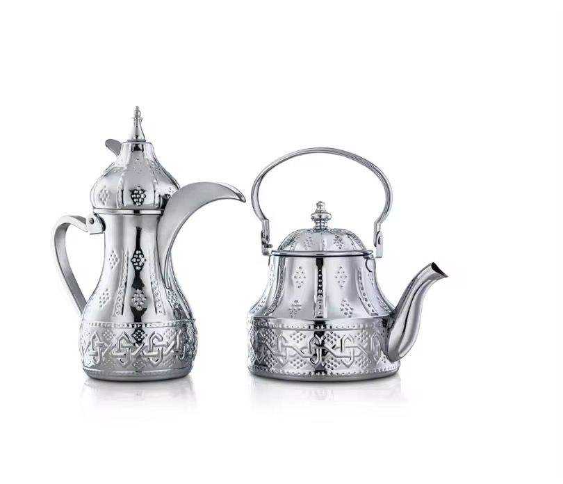 ชุดกาแฟและกาน้ำชาสแตนเลสสตีลแบบอาหรับ แก้วกาแฟแบบดัลลาห์สลักลาย กาต้มน้ำชาและกาแฟทันสมัย ทนทาน เหมาะเป็นของขวัญสำหรับใช้ในบ้าน