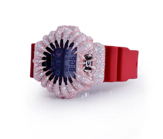 ตัวเรือนสแตนเลสสตีล ขอบหน้าปัดสีแดงน้ำแข็งชมพู สายสแตนเลสสตีล นาฬิกากันน้ำได้ 10 บาร์